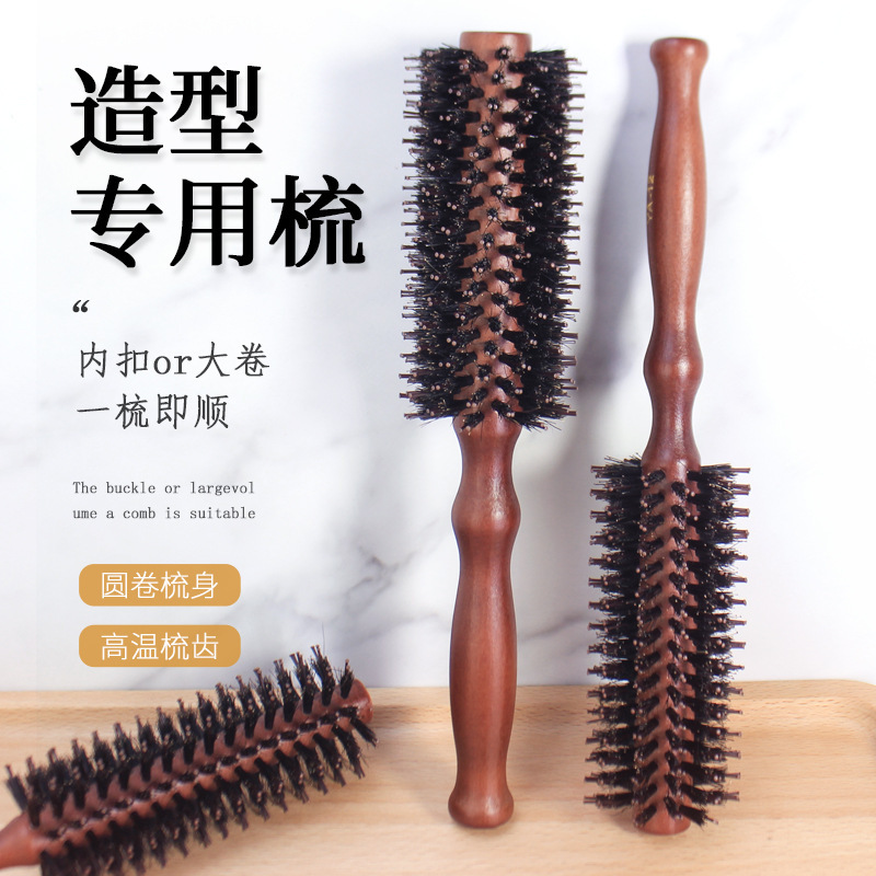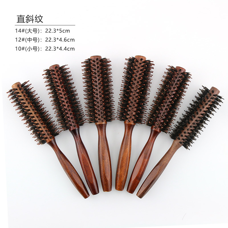 ヘアサロン木製コーム、カーリングヘアコーム、ヘアスタイリング猪毛木製コーム、円筒ヘアコーム、男性用および女性用ローリングコーム
