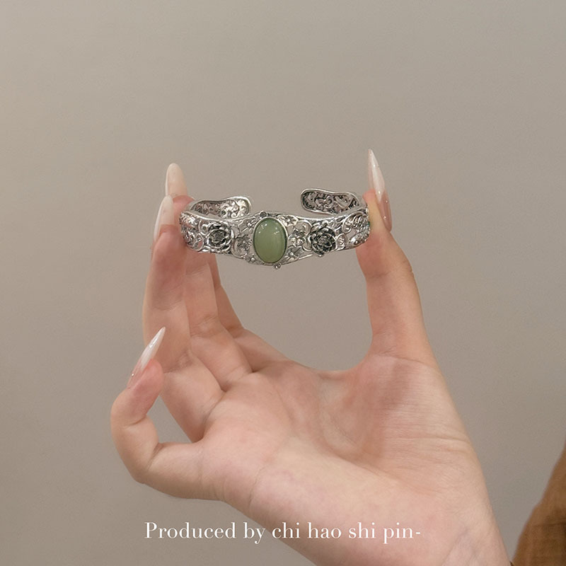新中式复古做旧莲花锦鲤手镯女清冷感手环中国风镂空雕花开口手饰