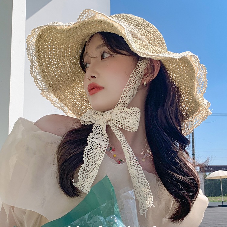 韓国の手編みの女性の麦わら帽子の大きい縁は折り畳みの砂浜の帽子の海辺の蝶結びの日よけの帽子のファッションの韓国版の女性の夏です。