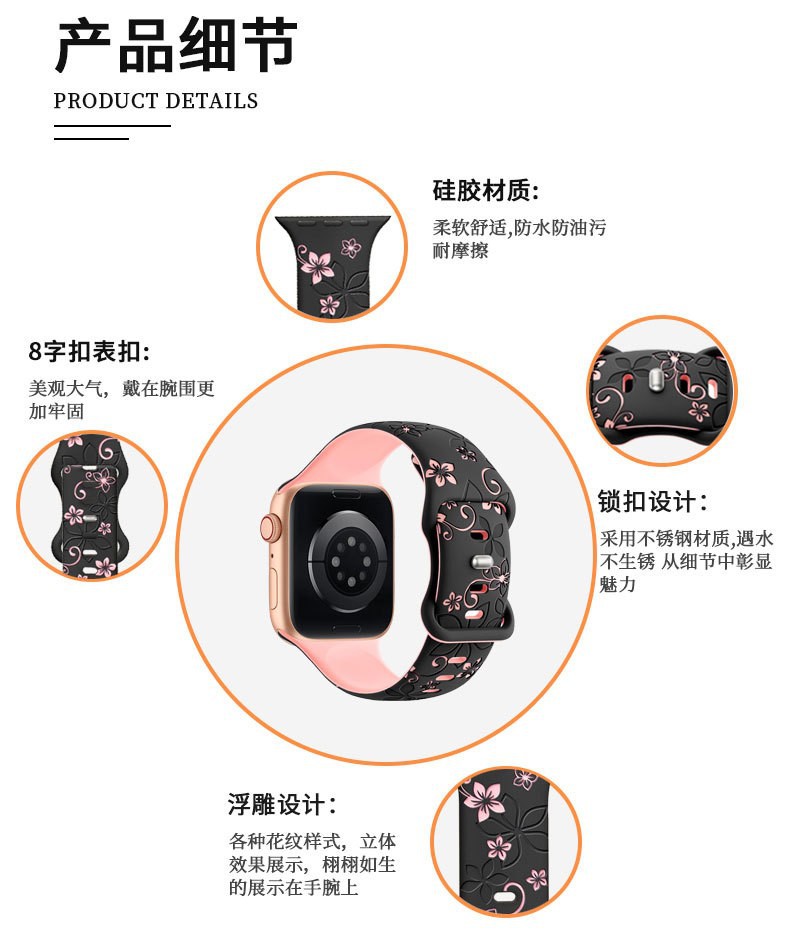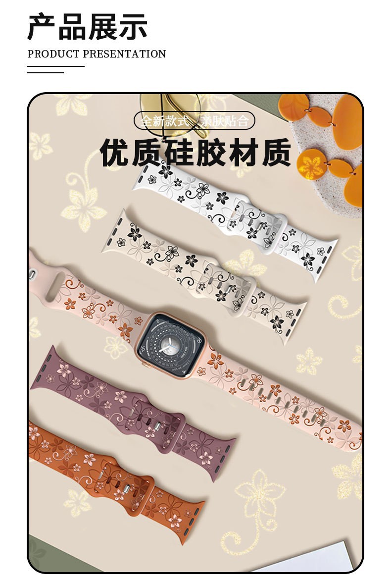 Applewatchに適しています。調節可能な時計ストラップ、ひまわりの彫刻が施されたシリコンストラップ、ファッショナブルでカジュアルなAppleストラップです。