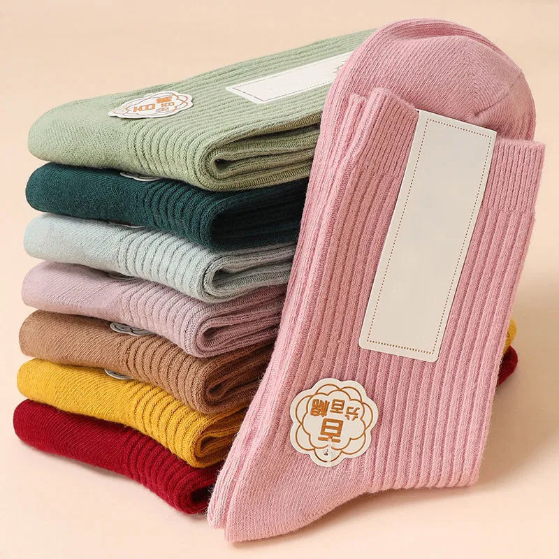 靴下の女性秋の冬の純色の二針は中筒の靴下を厚くします。