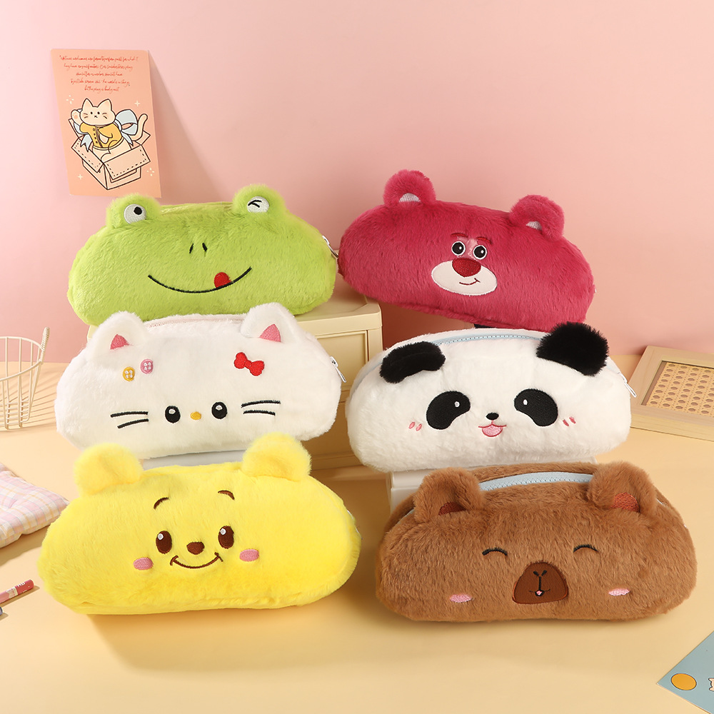 卡通毛绒笔袋卡皮巴拉草莓熊文具笔袋高颜值可爱拉链学生毛绒笔袋