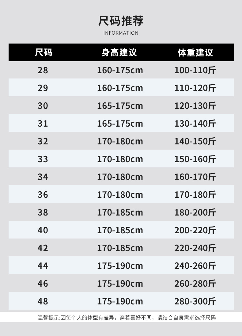 28 推奨 (100 ~ 110) ポンド,29 推奨 (110-120) ポンド,30 推奨 (120 ~ 130) ポンド,31 推奨 (130 ~ 140) ポンド,32 推奨 (140 ~ 150 ポンド),33 推奨 (150 ~ 160) ポンド,34 推奨 (160 ~ 170) ポンド,36 推奨 (170-180) ポンド,38 推奨 (180 ~ 200) ポンド,40 推奨 (200-220) ポンド,42 推奨 (220 ~ 240) ポンド,44 推奨 (240 ~ 260) ポンド,46 推奨 (260-280) ポンド,48 推奨 (280 ~ 300) ポンド