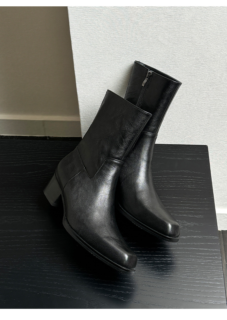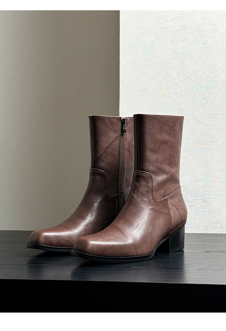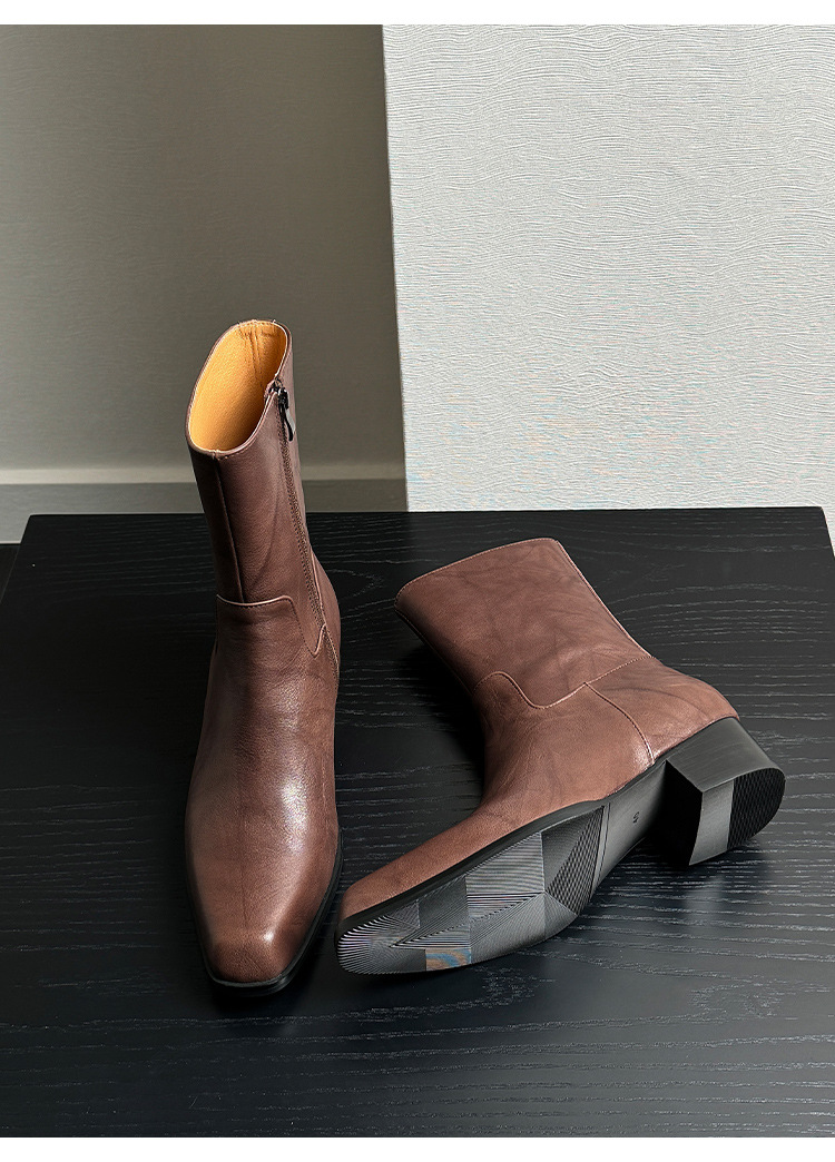 新しいブーツの男性のミディアムブーツの四角いハイヒールの手で紋様の頭の層の牛革の側のファスナーのハイヒールをつかみます。