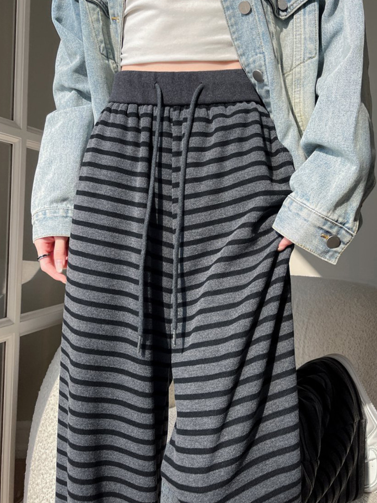 复古条纹针织阔腿裤女春秋抽绳松紧高腰显瘦慵懒垂坠感休闲拖地裤