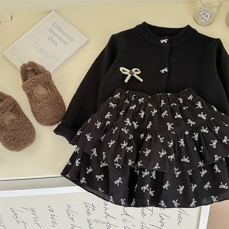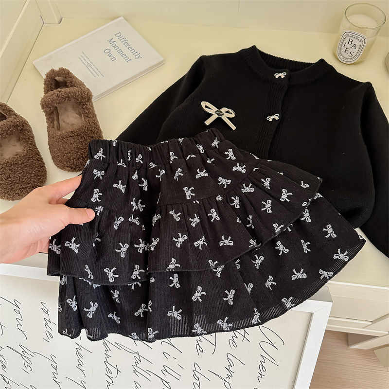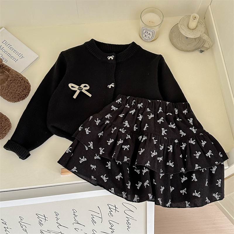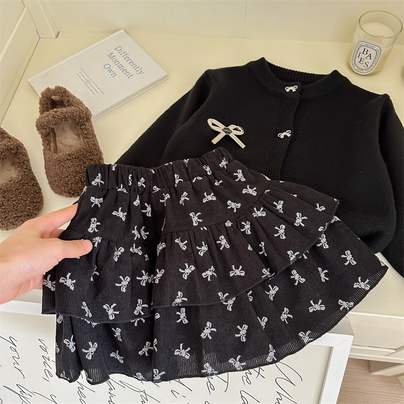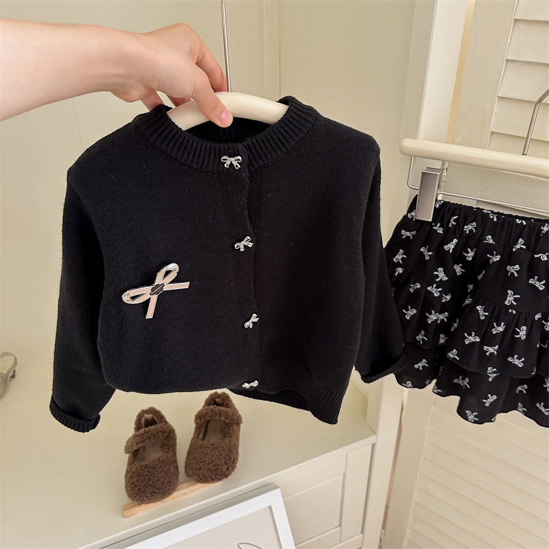 春秋新款女童套装2025针织毛衣开衫蝴蝶结印花半身裙两件套跨境