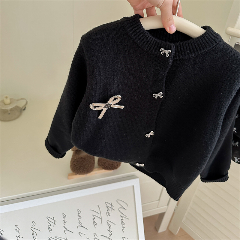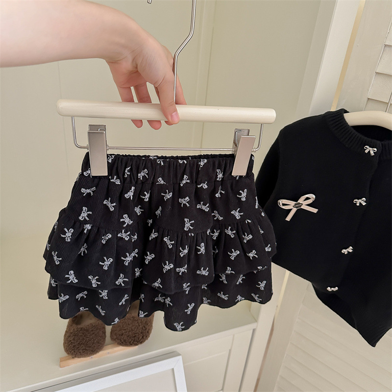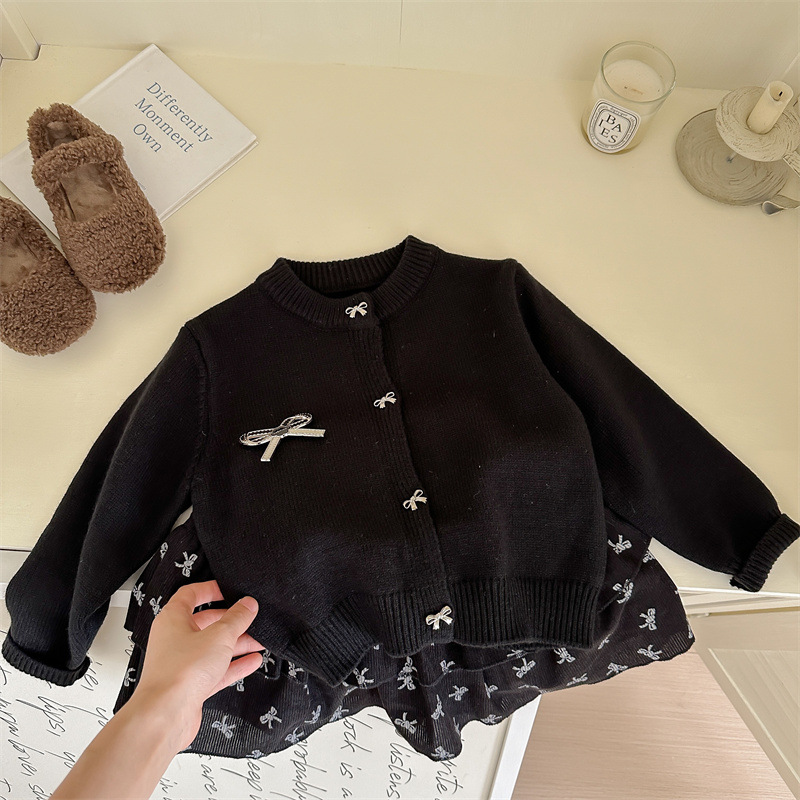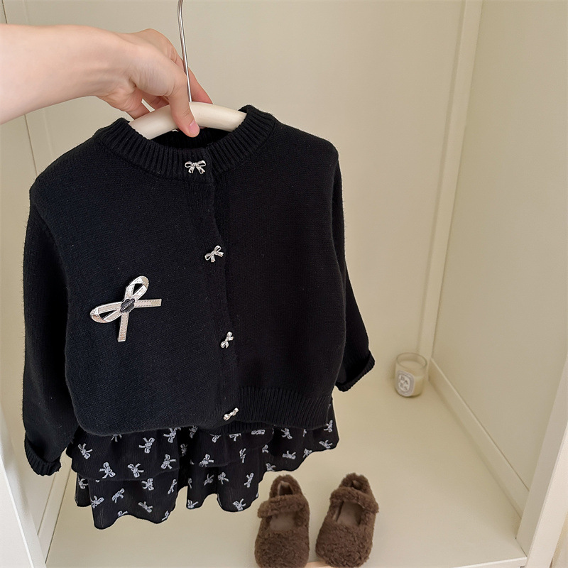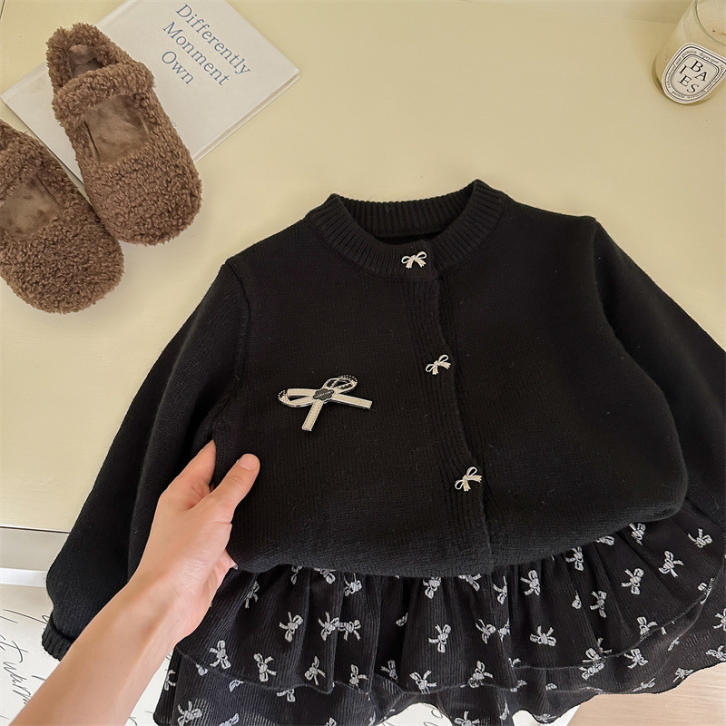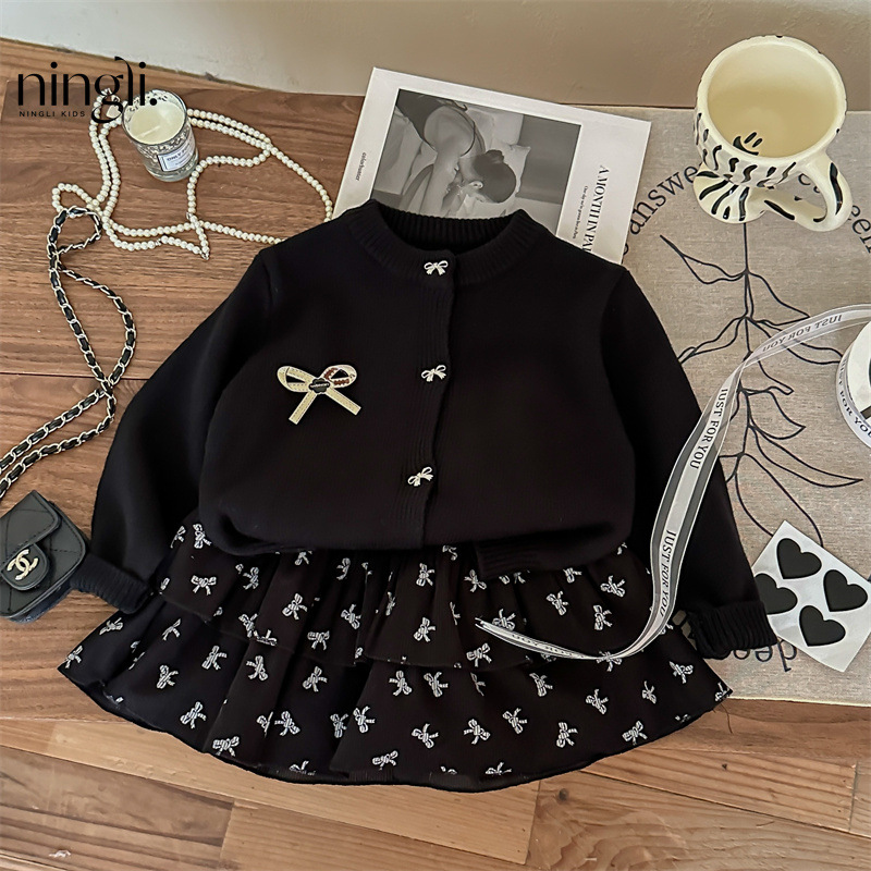 春秋新款女童套装2025针织毛衣开衫蝴蝶结印花半身裙两件套跨境