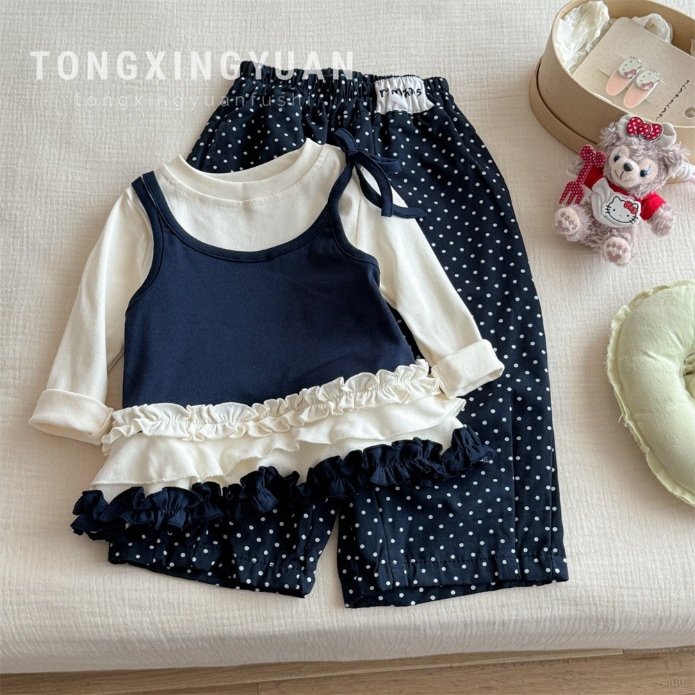 童星圆女童甜酷风套装秋季新款儿童洋气花边假两件上衣波点阔腿裤