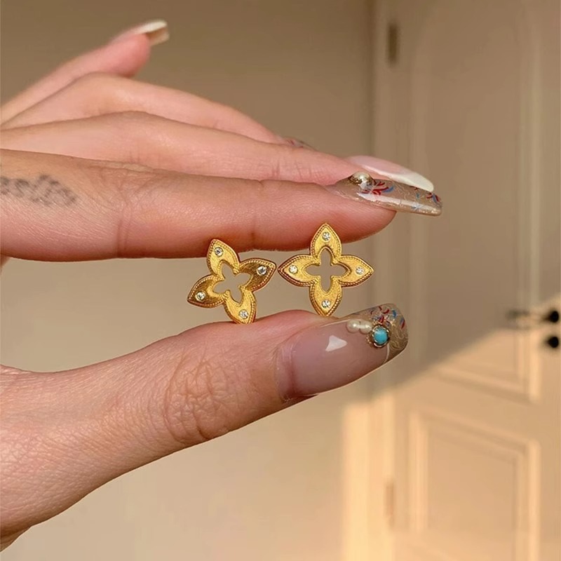 中古vintage拉丝四叶草镂空镶钻耳钉女高级感轻奢复古宫廷耳饰