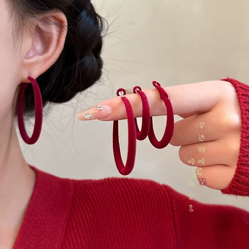 安可拉紅植毛耳輪女復古香港風秋冬百合イヤリング独特誇張酒赤色円耳飾り