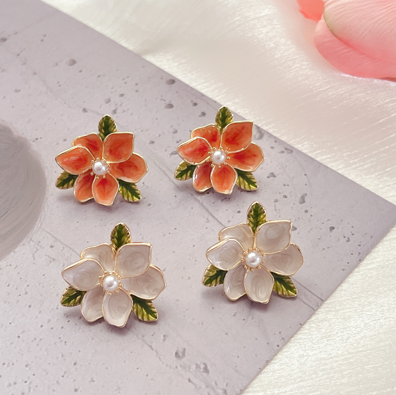ヴィンテージフレンチレトロライト高級クチナシエナメルパール925シルバー針イヤリングニッチデザイン新しいスタイル