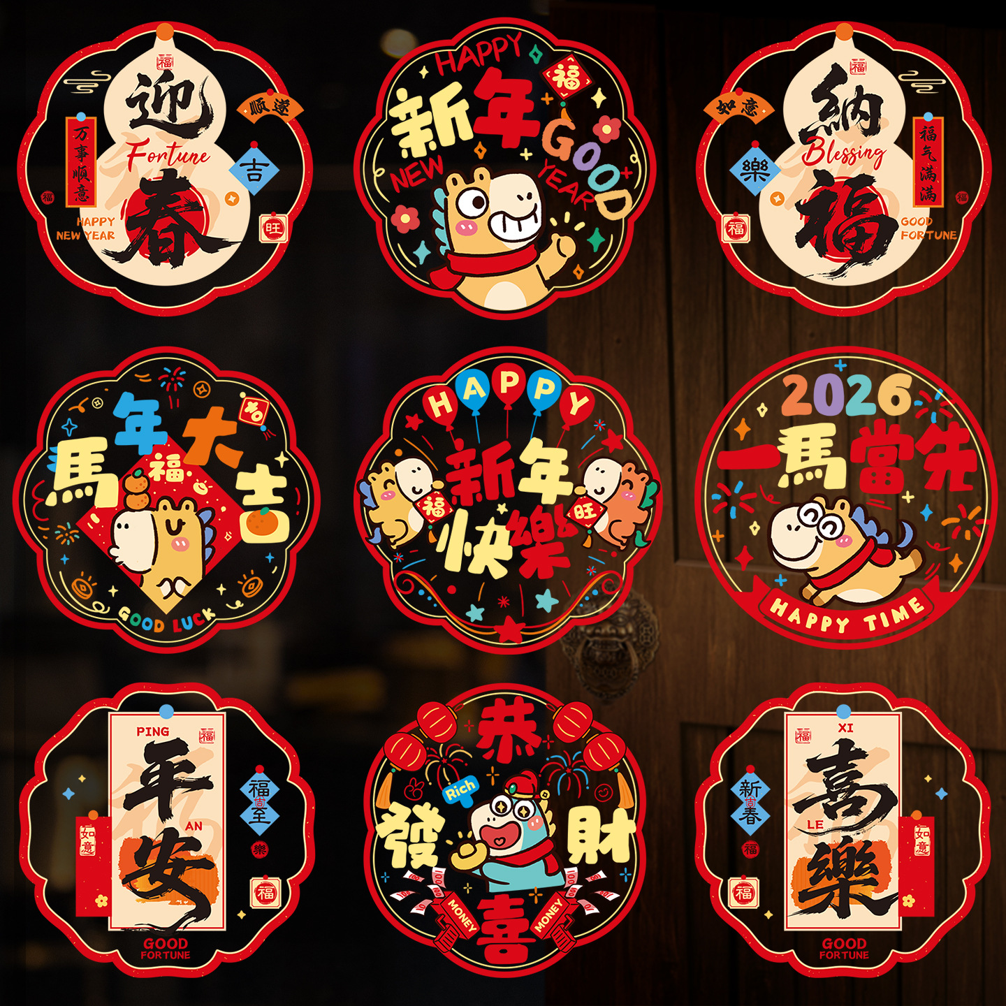 新年装饰窗花马年春节春联福灯笼窗贴2026过年橱窗静电玻璃门贴纸