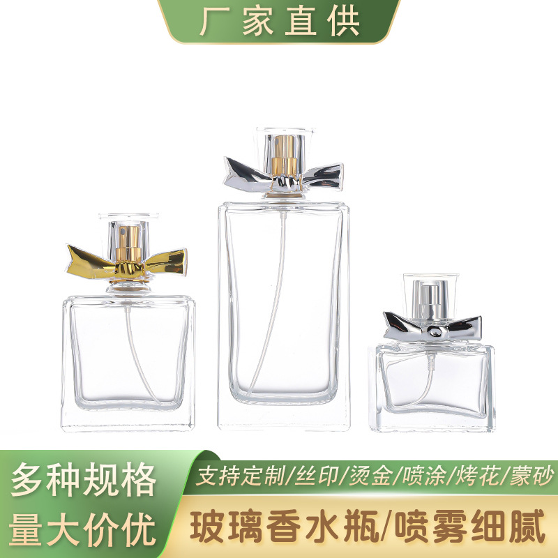 蝶結び香水瓶、正方形、透明ガラススプレーボトル、25ml、携帯用サンプル詰め替えボトル