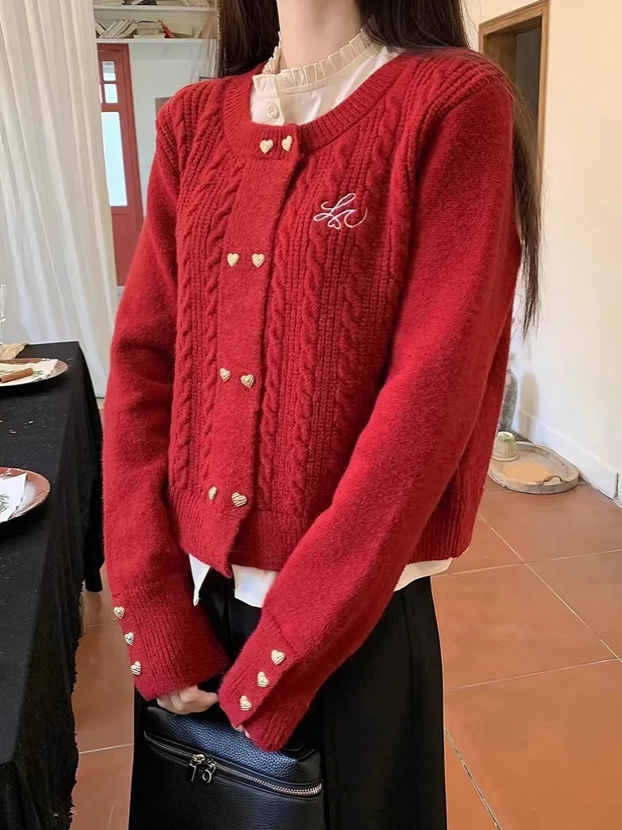 秋冬新款刺绣设计感假两件针织衫女宽松短款开衫红色毛衣潮