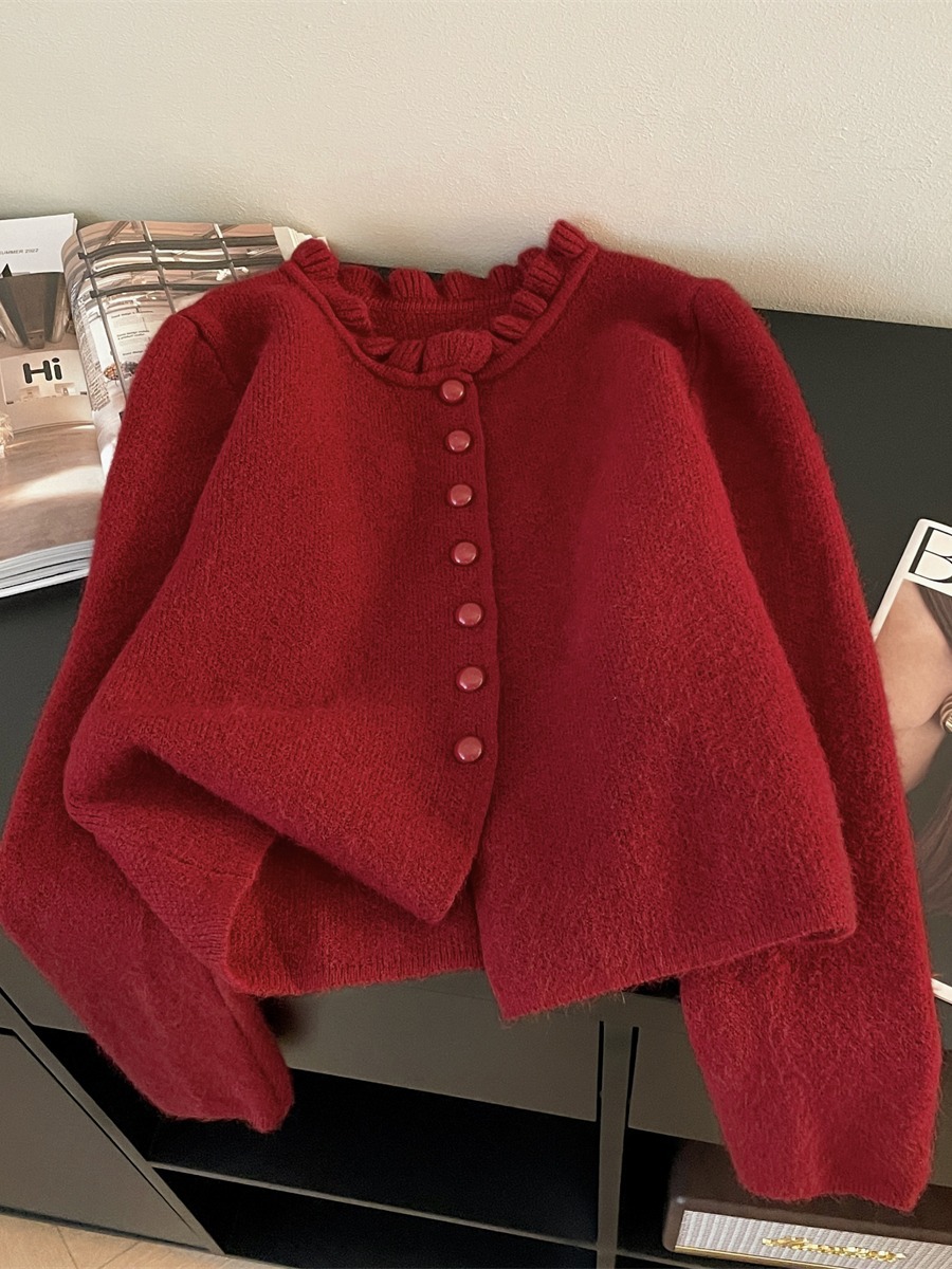 过年法式温柔红色木耳边毛衣开衫女秋冬季氛围感漂亮上衣针织外套