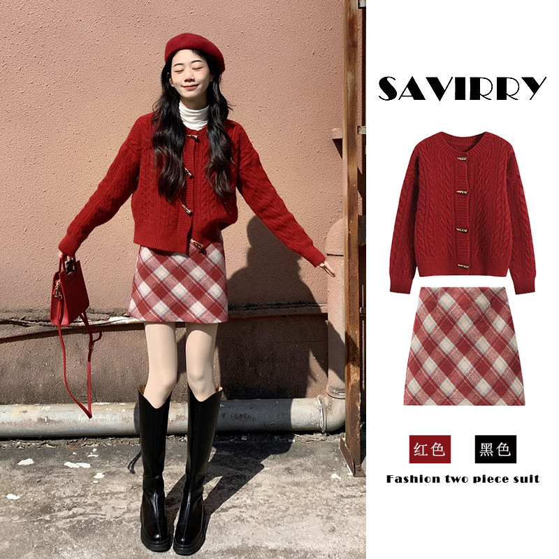 春季新款红色毛衣针织开衫外套喜庆红色格子半身裙子套装女装