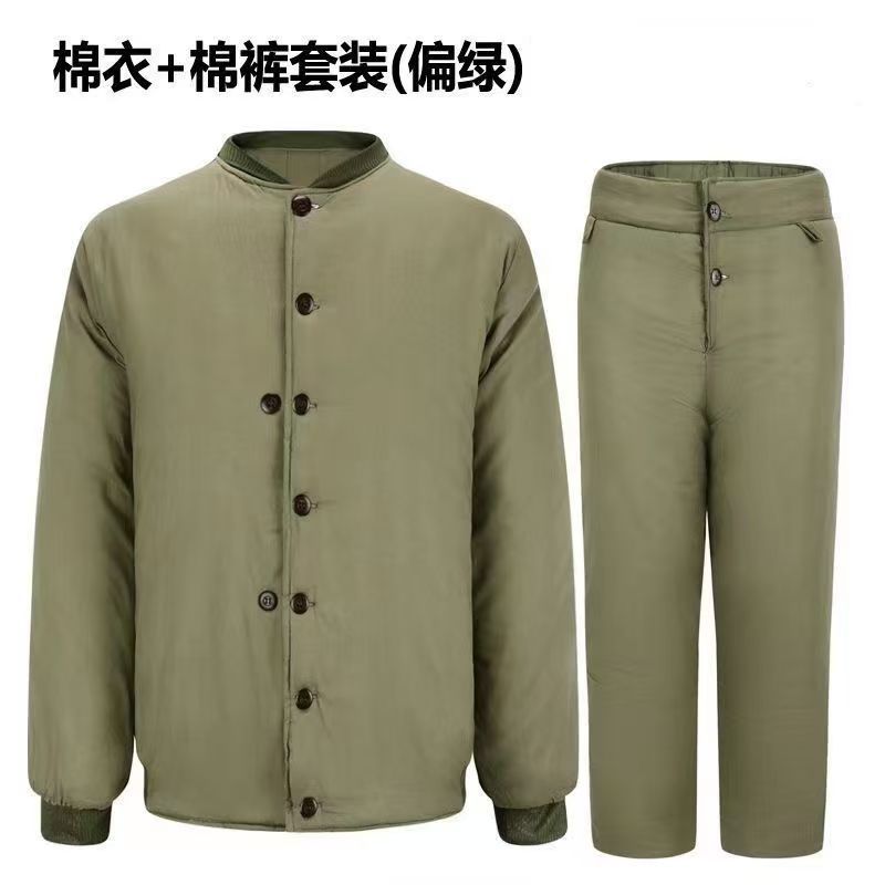 昔ながらの白い綿の作業服、軍用綿ジャケット、超厚手で汚れにくい緑色のセット、冷蔵倉庫や工事現場での保温用厚手の綿ズボン