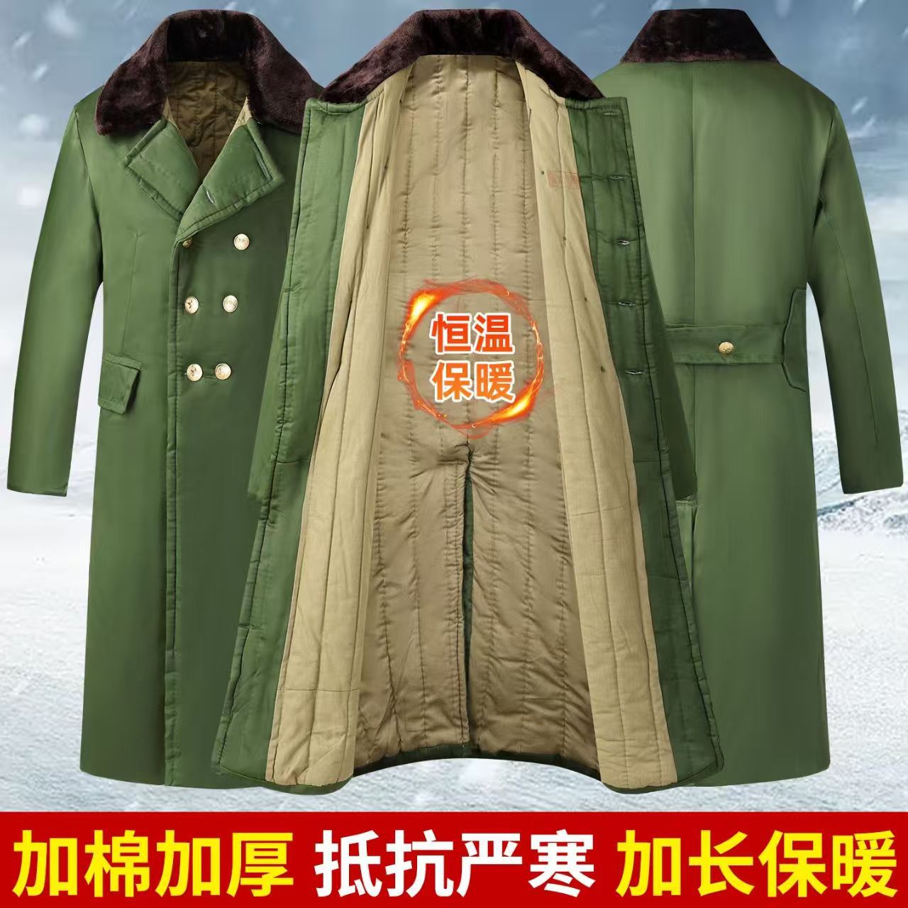 冬用男女兼用ミリタリーコート、膝丈以上のロング丈、緑色の昔ながらの厚手コットン服、極厚で暖かく、防寒、防風、保冷に最適