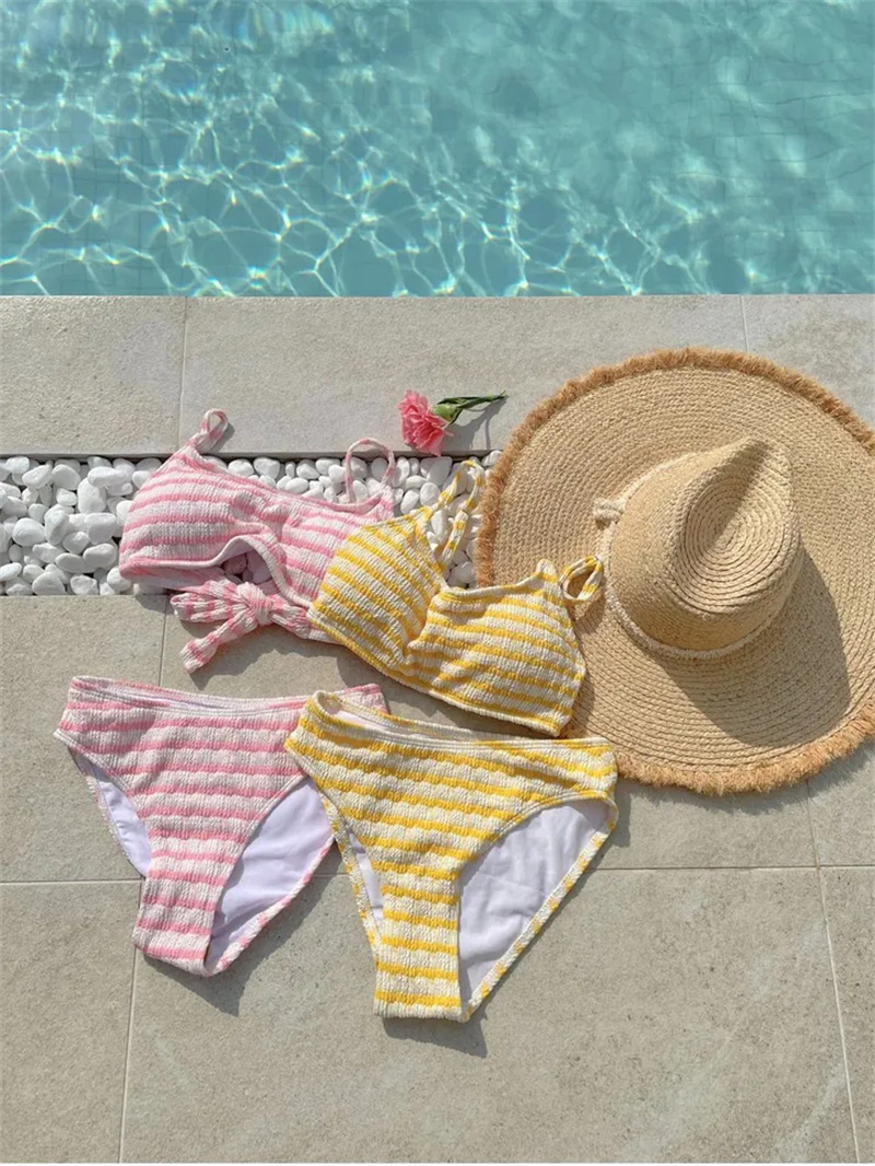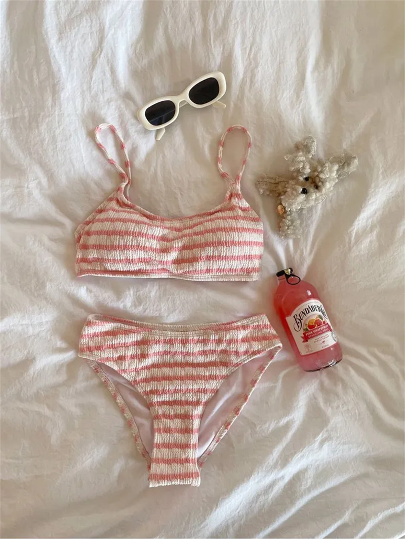 韓国insかわいい甘い縞の分体水着女性2025夏の新しい胸がスポーツビキニを集めた