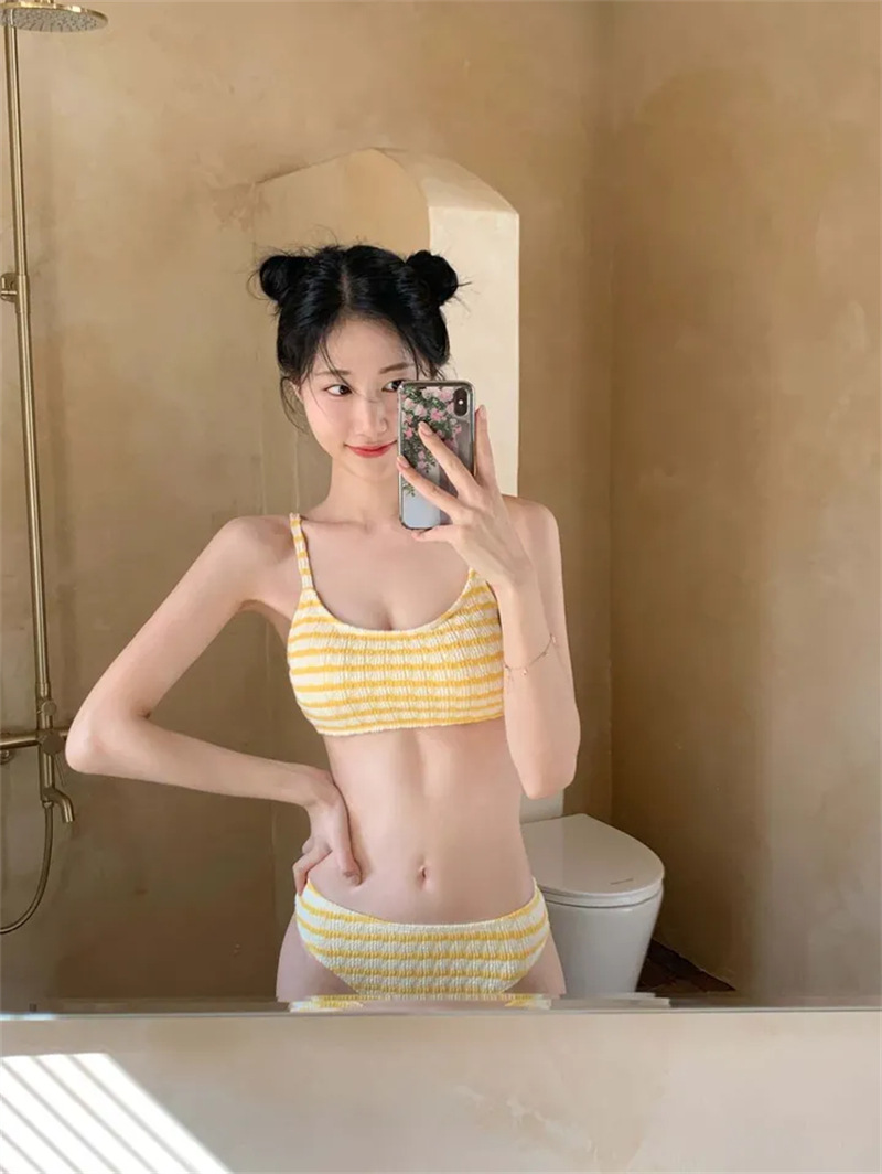 源工場クロスボーダー韓国純欲少女小香風ストライプハイウエスト隠し腹小胸分体水着女性