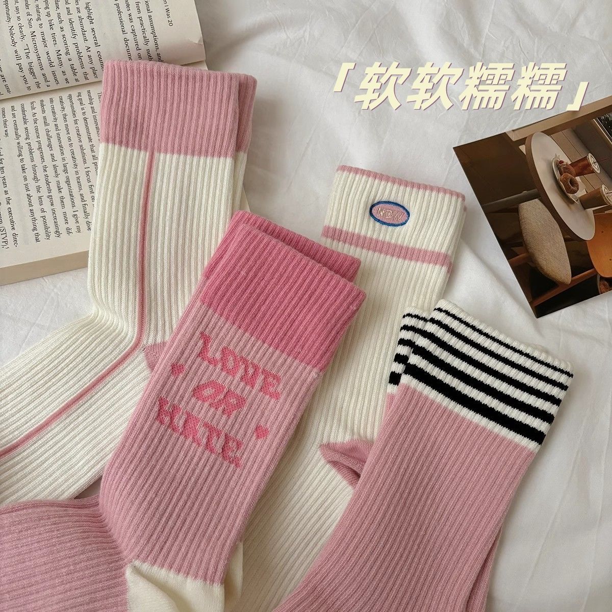 粉色鲨鱼袜子女ins潮百搭条纹字母学生中筒袜女运动袜简约韩系袜