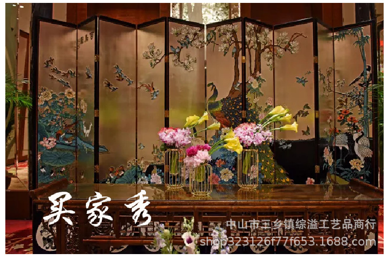 ハイエンドの黒い手描きの花鳥屏風は豪華な玄関を遮断します。