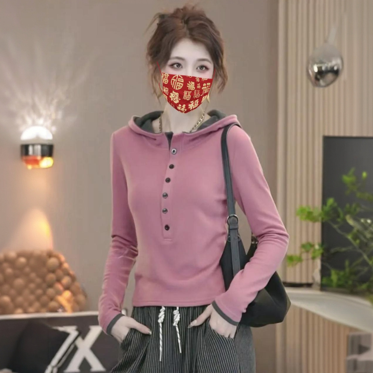 厂家直供时尚秋冬德绒连帽打底衫女撞色纽扣长袖减龄百搭显瘦上衣