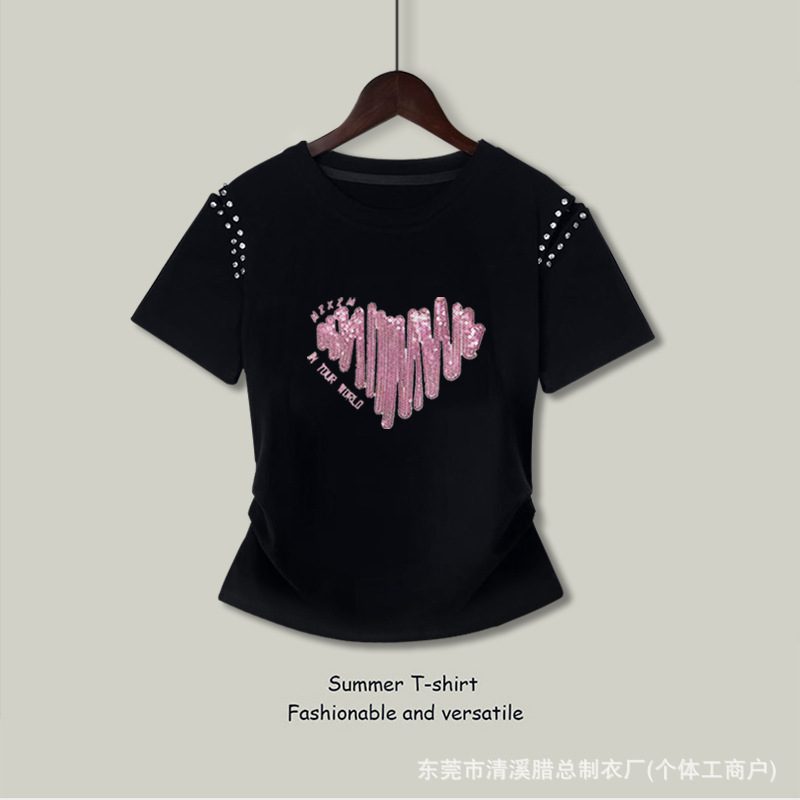 メーカーは、潮の90% 綿の10% スパンデックス半袖tシャツの女性の愛のビーズの刺繍のように評価されています