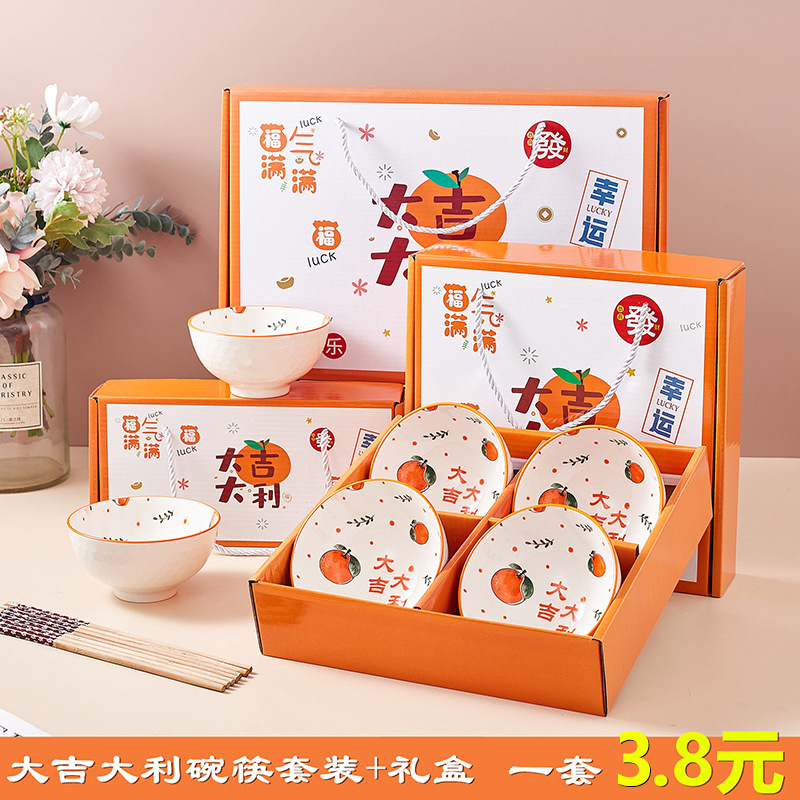 クロスボーダーアンダーグレーズカラーボウル、縁起の良い陶磁器のボウルと箸セット、家庭用食器、食事用ボウル、オープニングイベント記念品