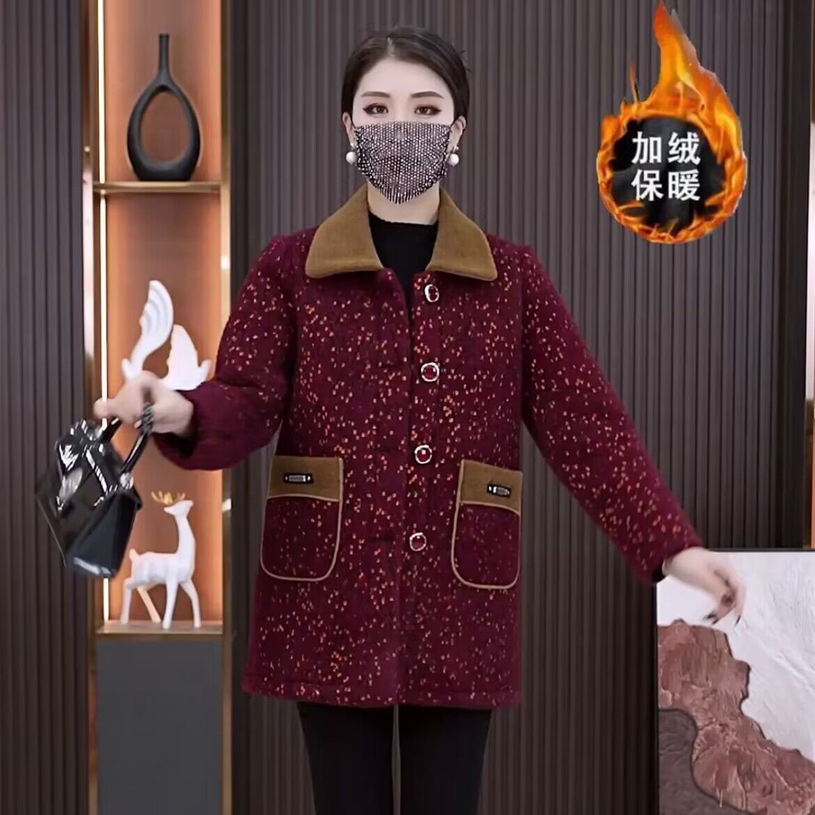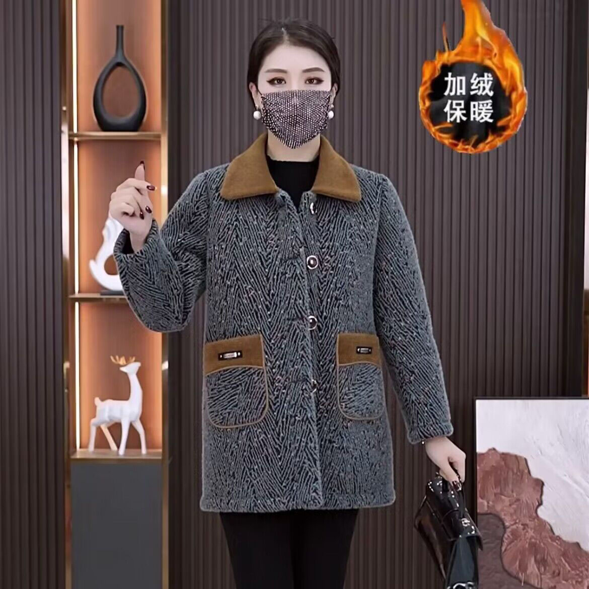 2024秋冬の新型ベルベットは保温上着を厚くして、カジュアルに年齢を減らした洋気スウェットの立襟羊小毛コートの女性を厚くした