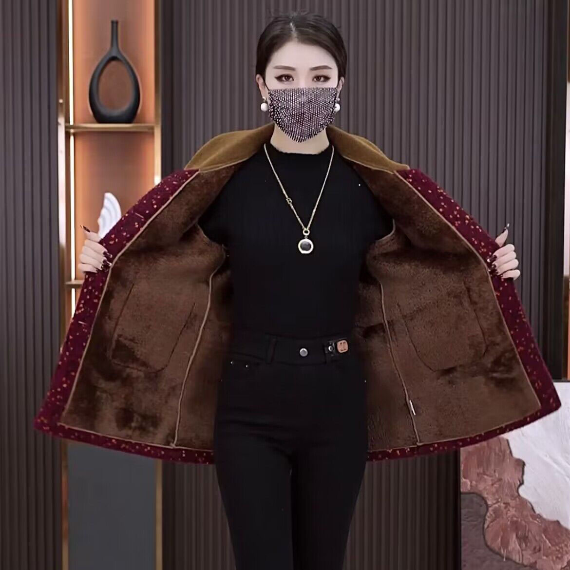 高級ベルベットの厚手のコートの女性2024秋冬の新しい洋気が痩せている小柄なコート