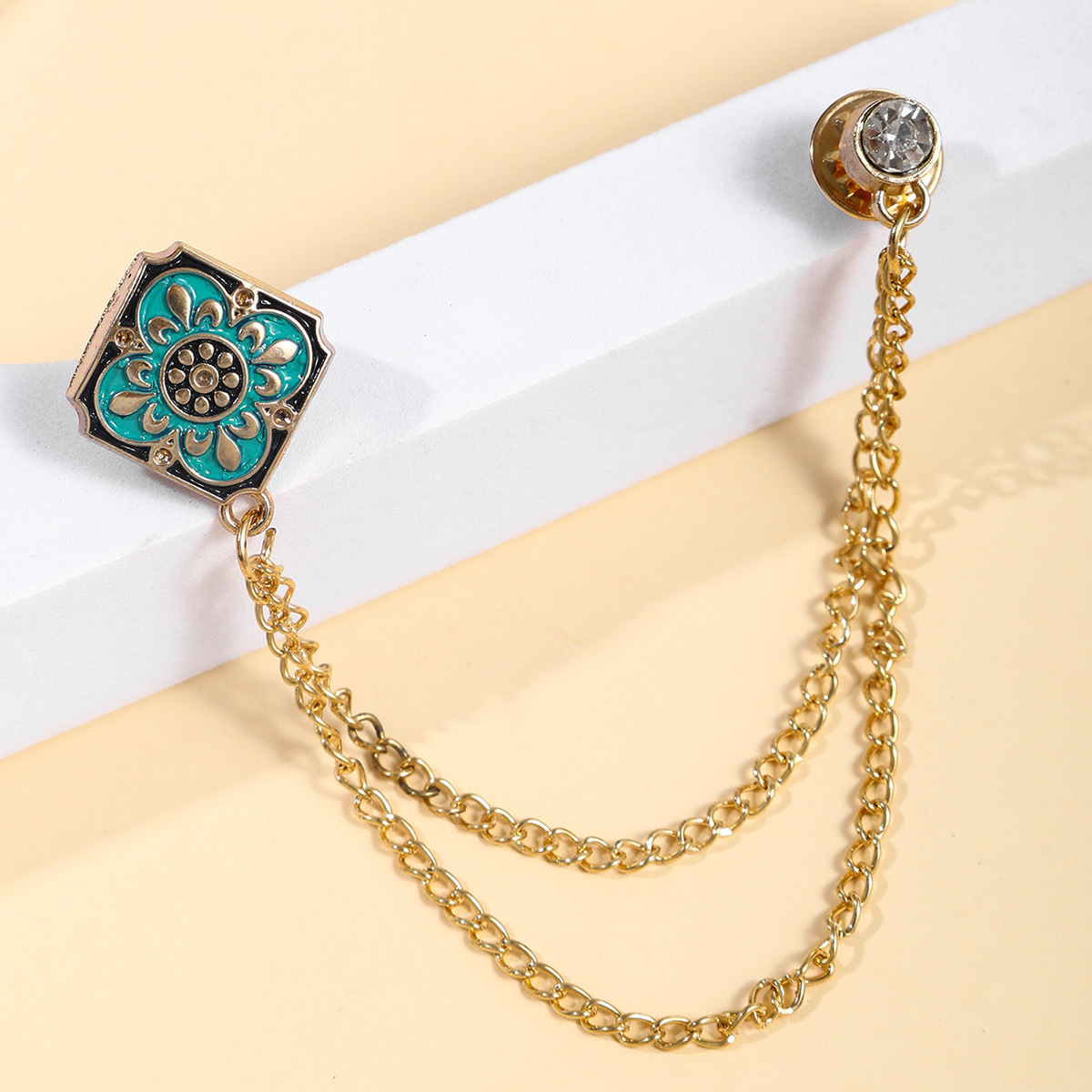 国境を越えた新しいレトロなブローチ宮廷緑チェーン正方形レトロな彫刻ブローチスポット卸売り