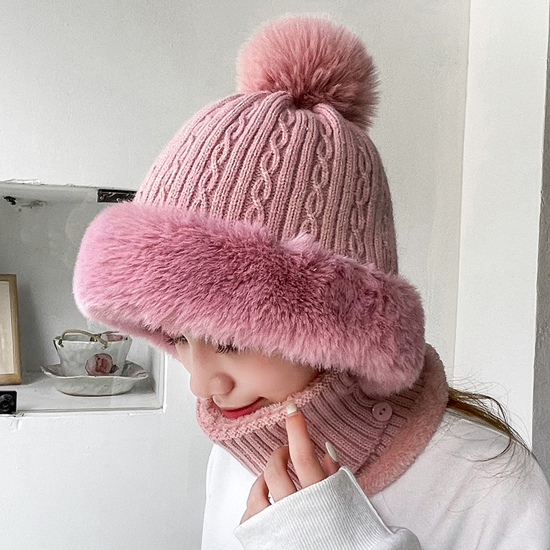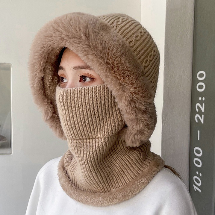越境秋冬毛羽立ち襟麻花連体帽子屋外騎行防寒毛羽立ち帽子厚手ニット毛糸帽子現物