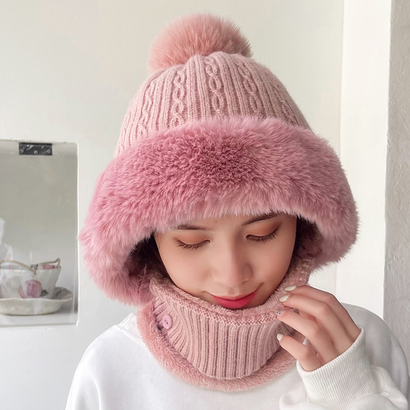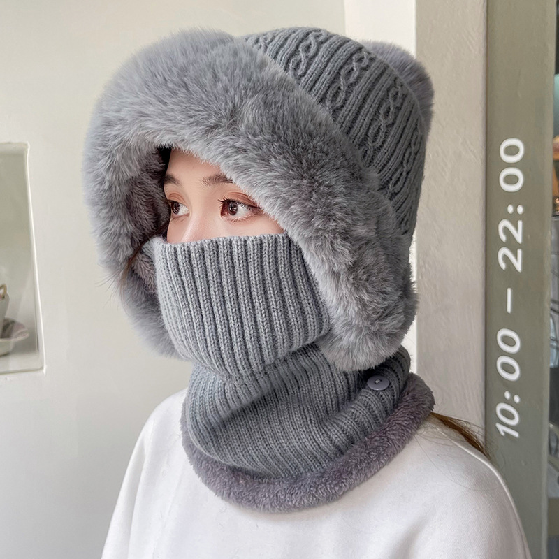 新型高弾力純色ニット帽子マフラーマスク連体帽子女性冬自転車防風保温帽子