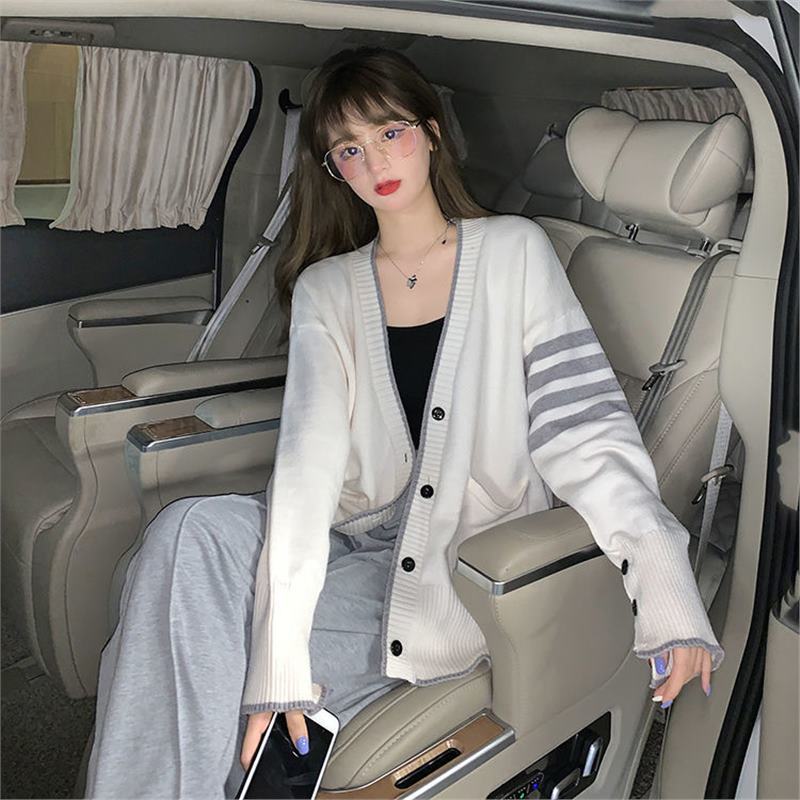 秋季新款韩版宽松V领撞色条纹休闲针织衫百搭开衫外搭毛衣上衣女