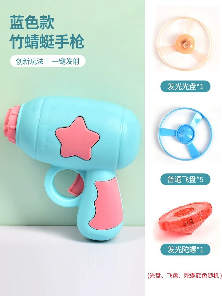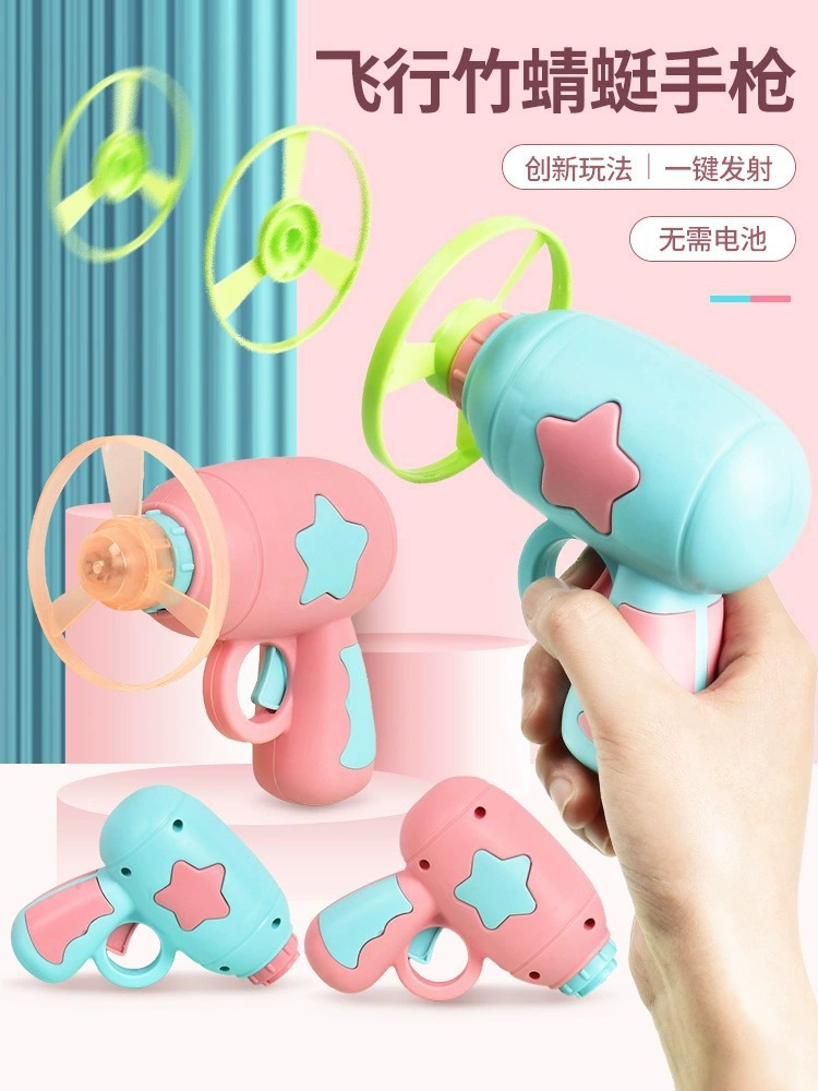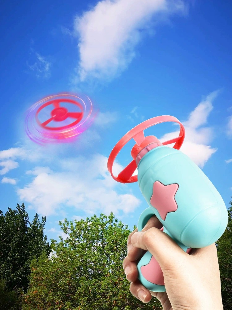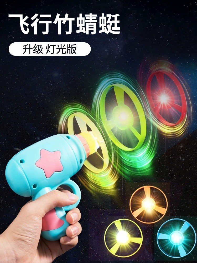 光る竹トンボのピストルの飛天の仙子の空飛ぶ円盤は回転のジャイロの飛盤の屋外の子供の男の子のおもちゃを発射します。
