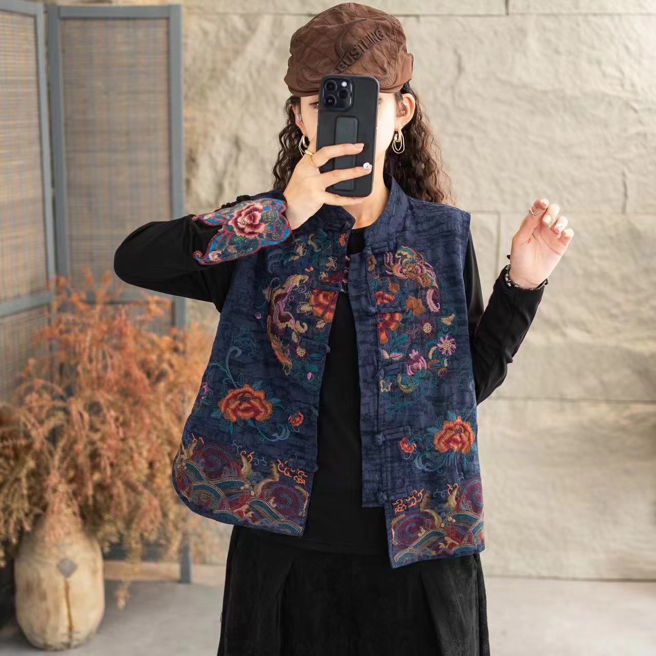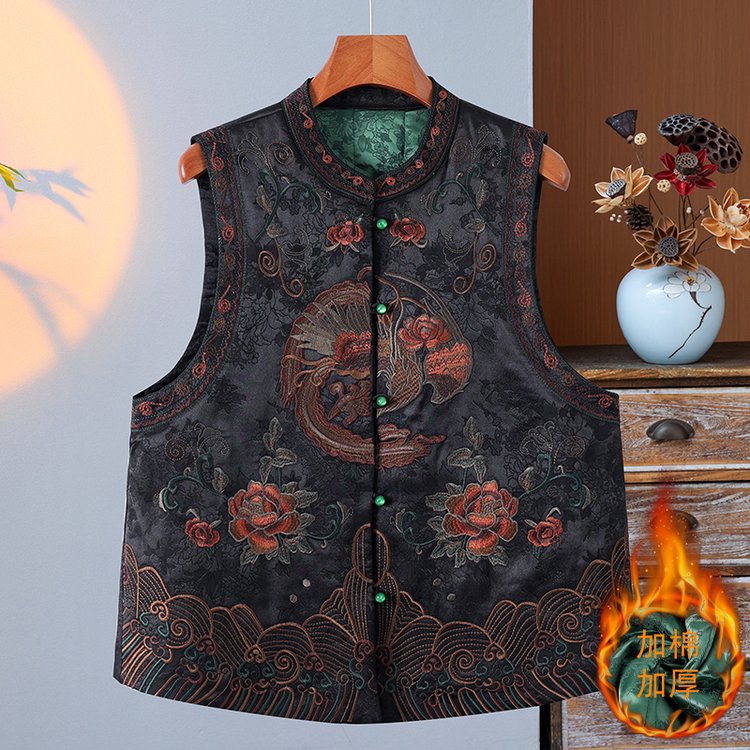【繁華】重工刺繍馬挟み新中国式国風唐装レトロ盤ボタンカン肩秋冬挟み綿馬甲女