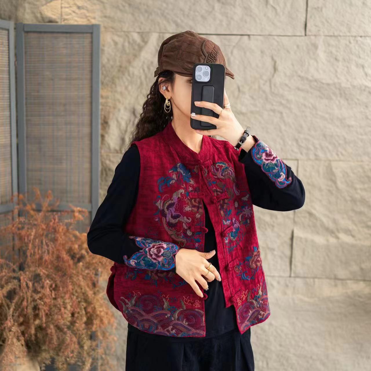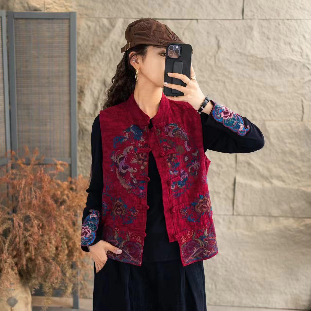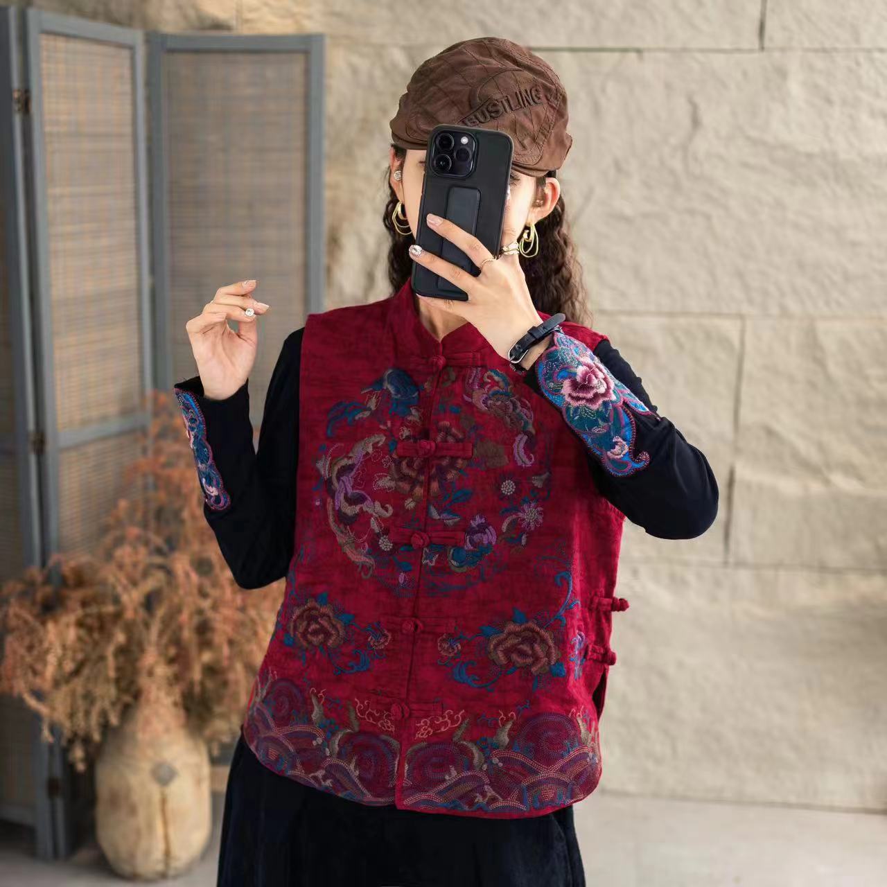 新中国式民族立襟新型重工刺繍綿麻馬甲国風カンカン肩復古ベストカーディガン