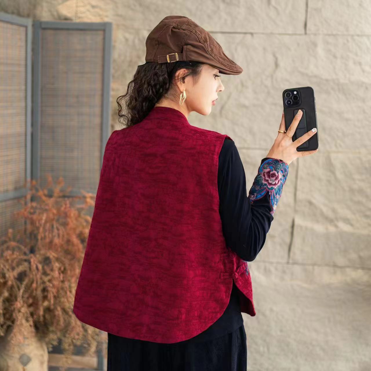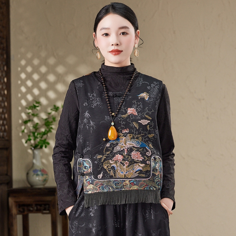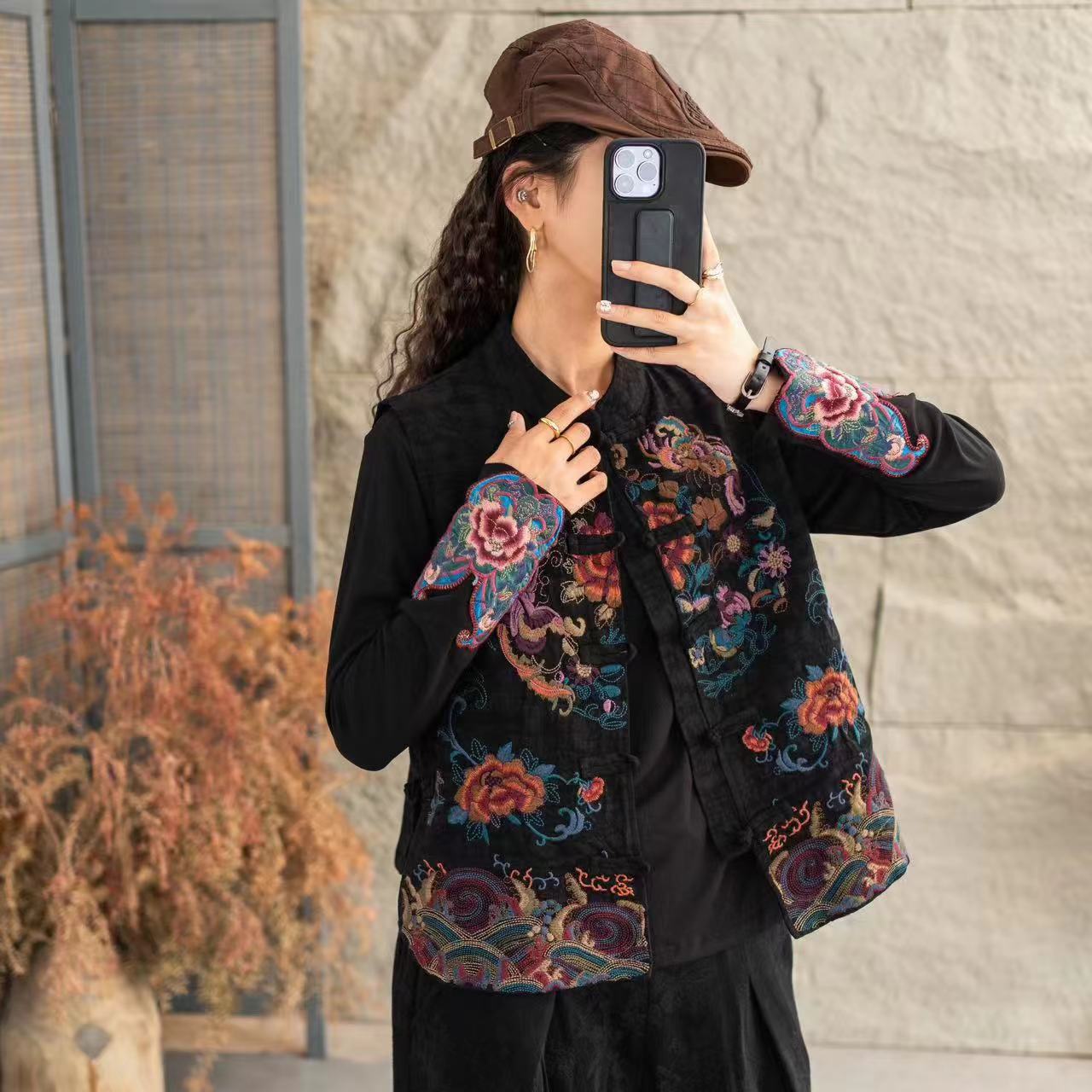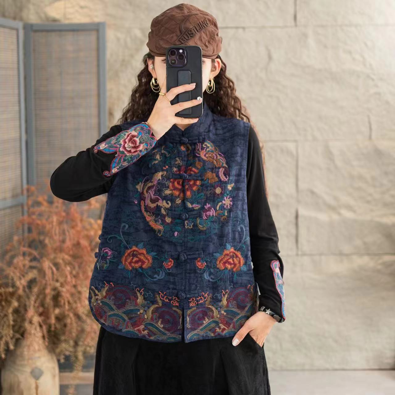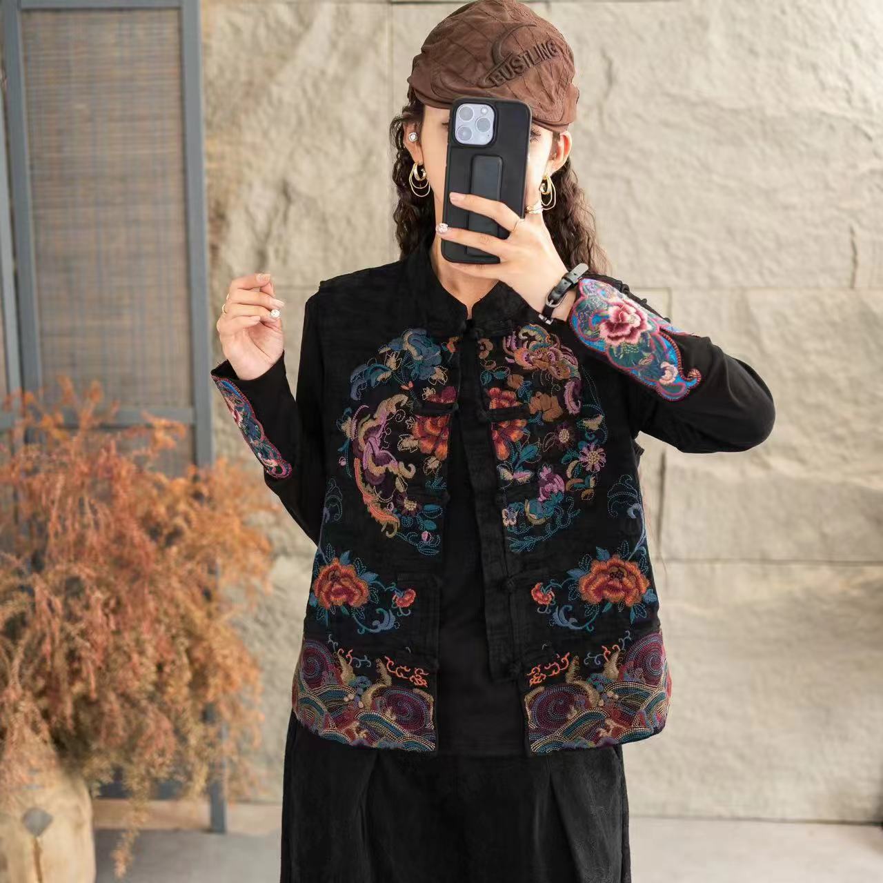 2025秋冬新款国风重工绣花短马甲复古盘扣背心立领民族风坎肩
