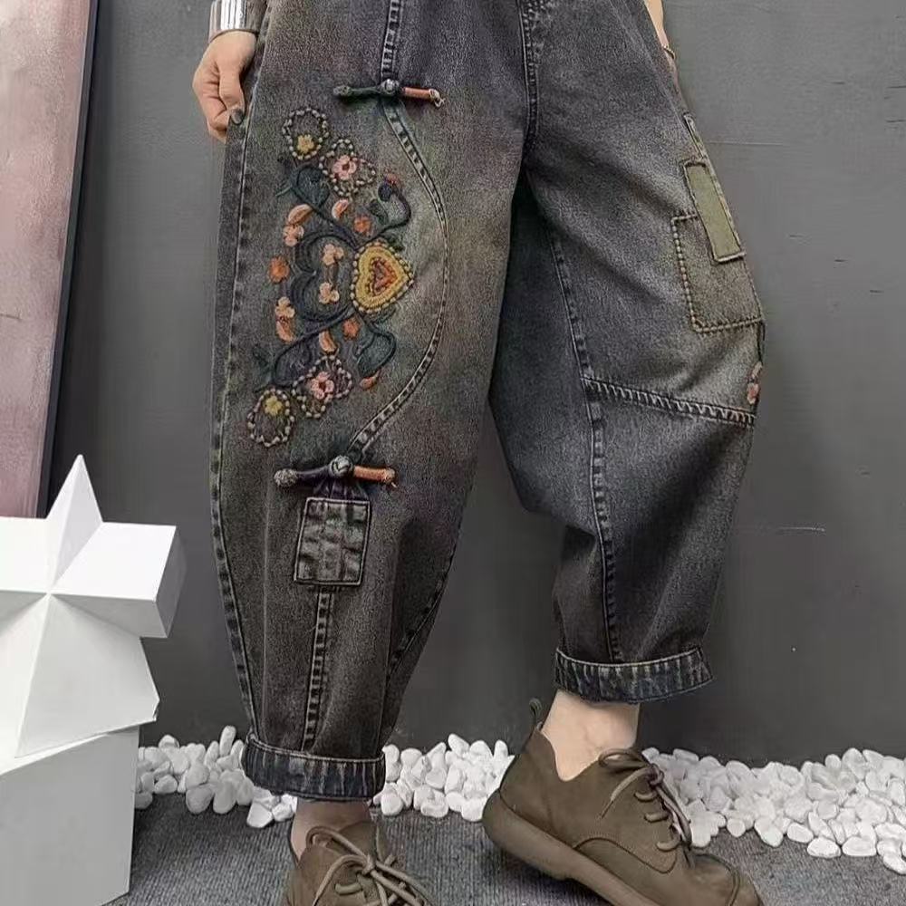 2025春のジーンズの女性の新商品は復古して古いゆったりとしたカジュアルな刺繍の砕花のジーパンをして腰のズボンを緩めます。