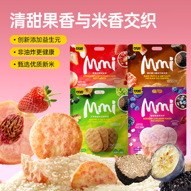 甘源新品168G草莓白桃味蓝莓桑葚芥末鳕鱼味五黑膨化米饼干箱规14
