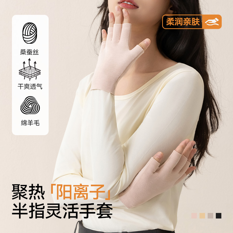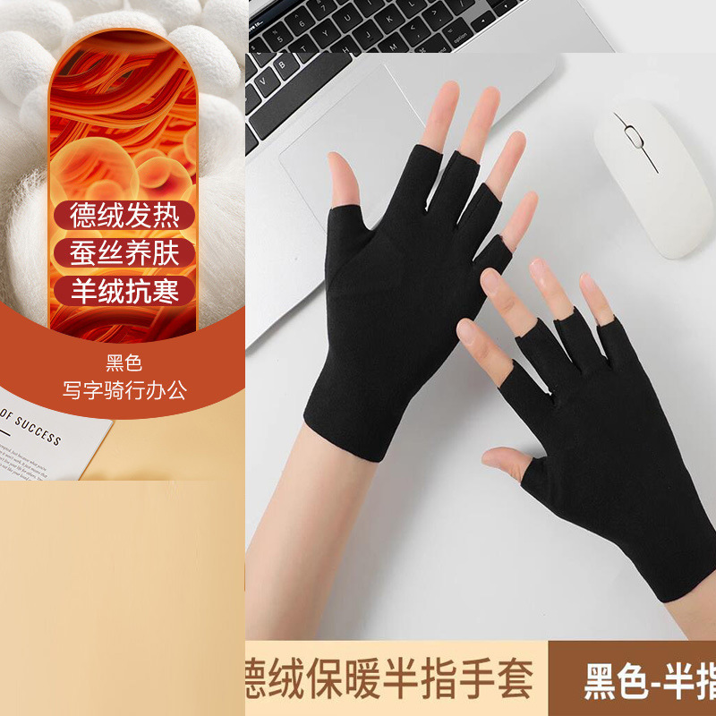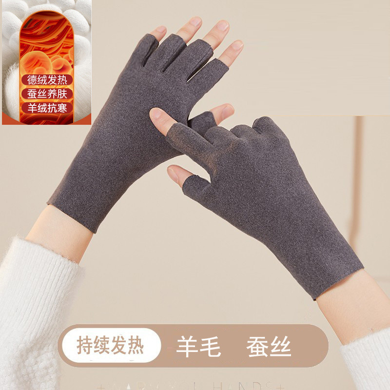 保暖手套半指女发热德绒羊毛蚕丝触屏秋冬露指学生男写字办公打字