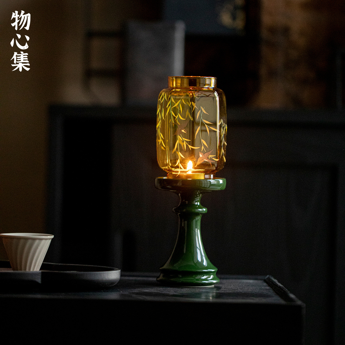 物心集新中式玻璃祖母绿烛台燕归氛围灯香薰蜡烛茶道配件桌面摆件