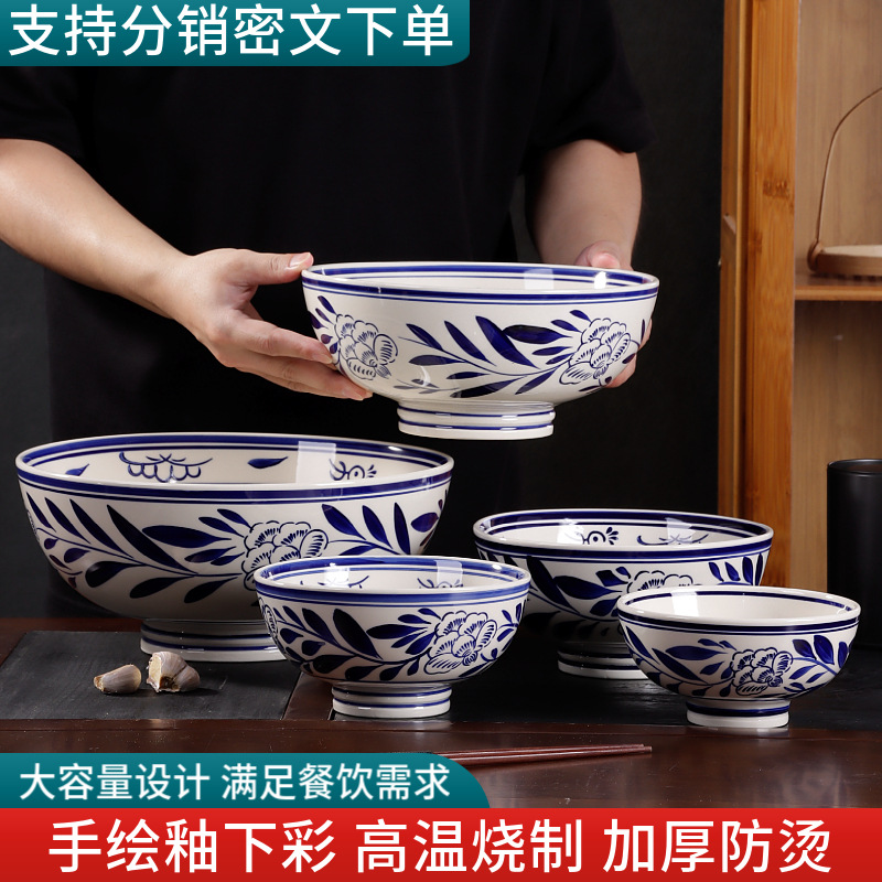 レトロな古い青花磁器の麺碗の家庭用の泡の碗の業務用の厚い熱いラーメンの麺館の陶磁器の大きいスープの碗