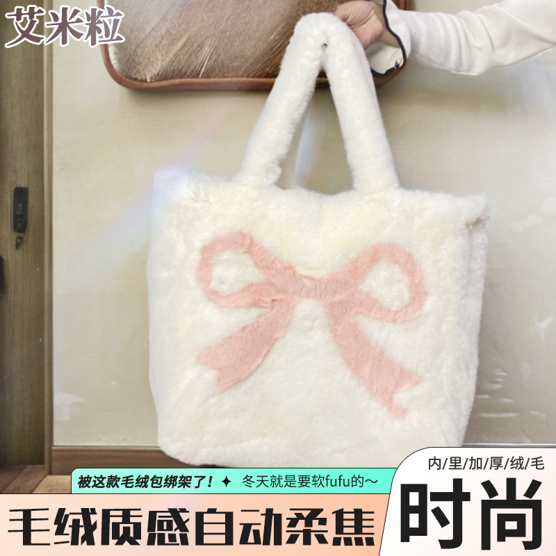大容量印花毛绒包秋冬新款蝴蝶结单肩包时尚百搭托特包