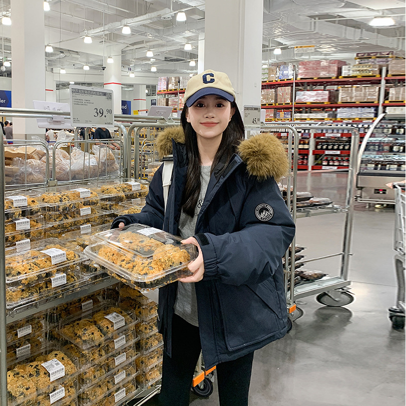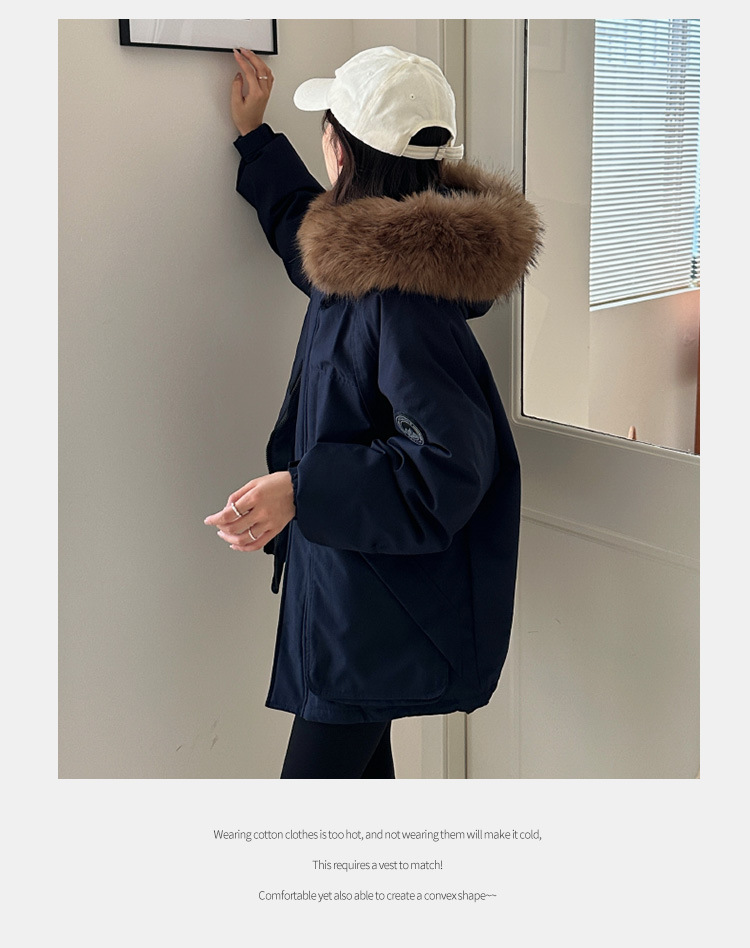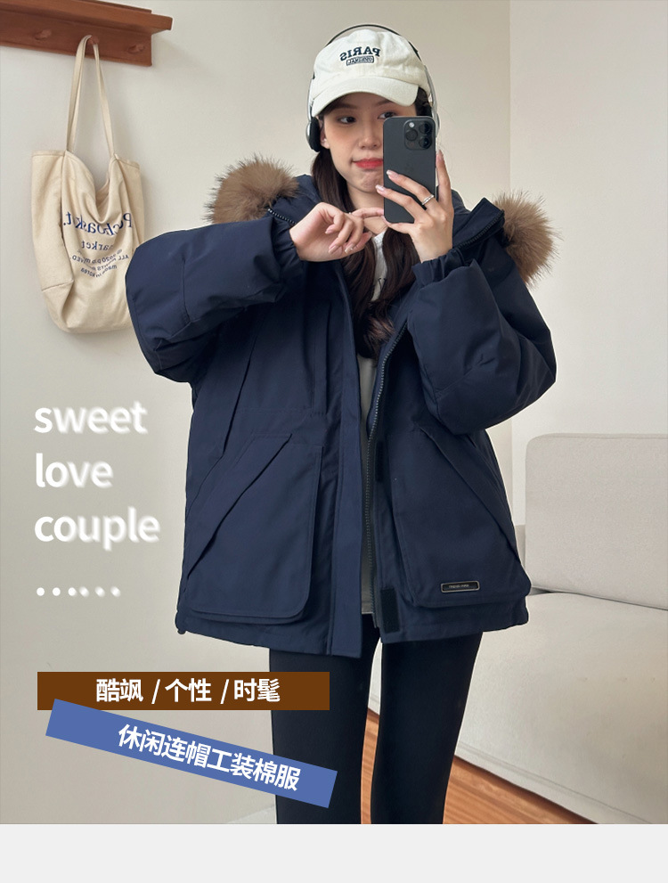 男女カップル作業服2025冬新作ファー襟パーカーダウンジャケットレディースミドル丈ゆったり小さめコートトレンド