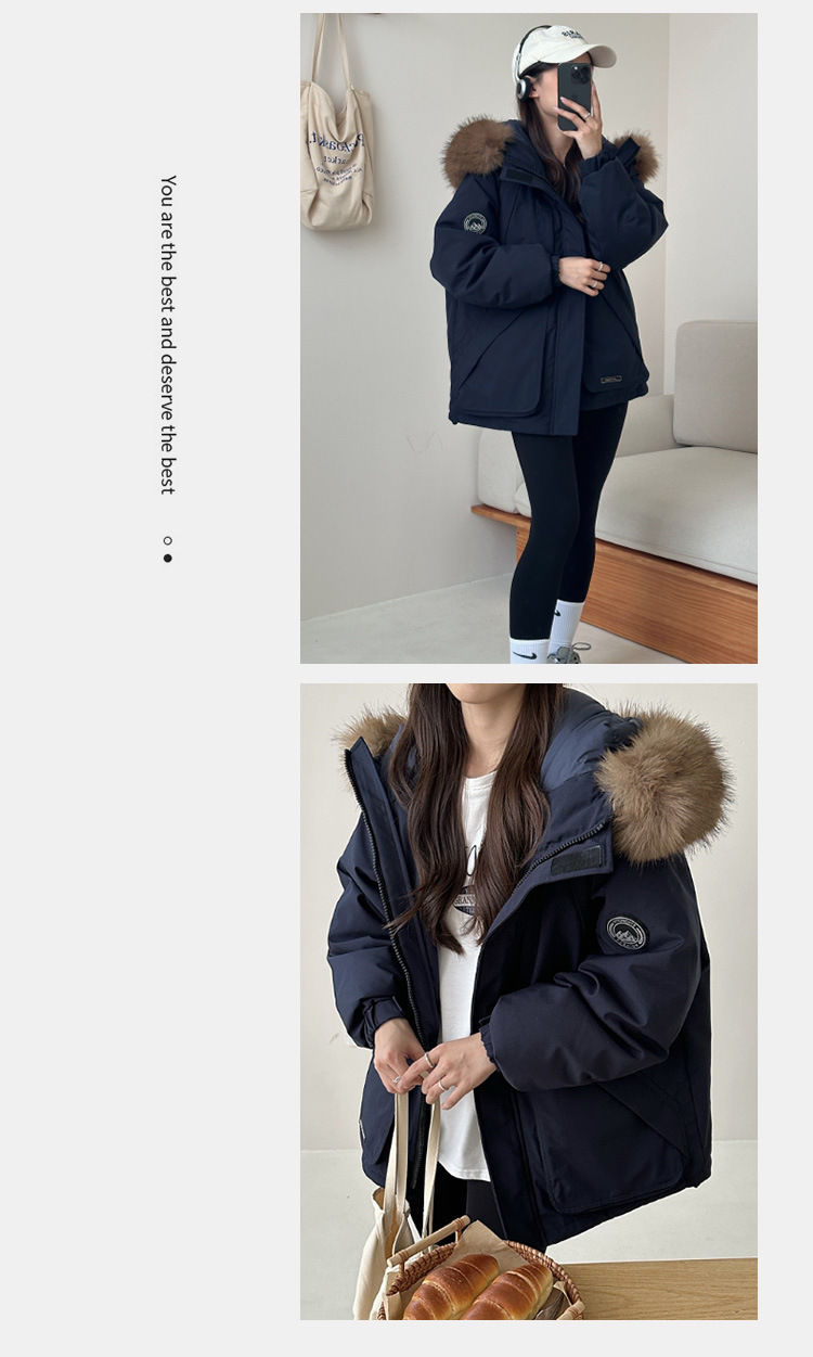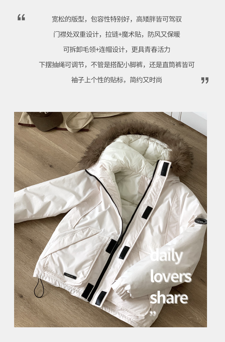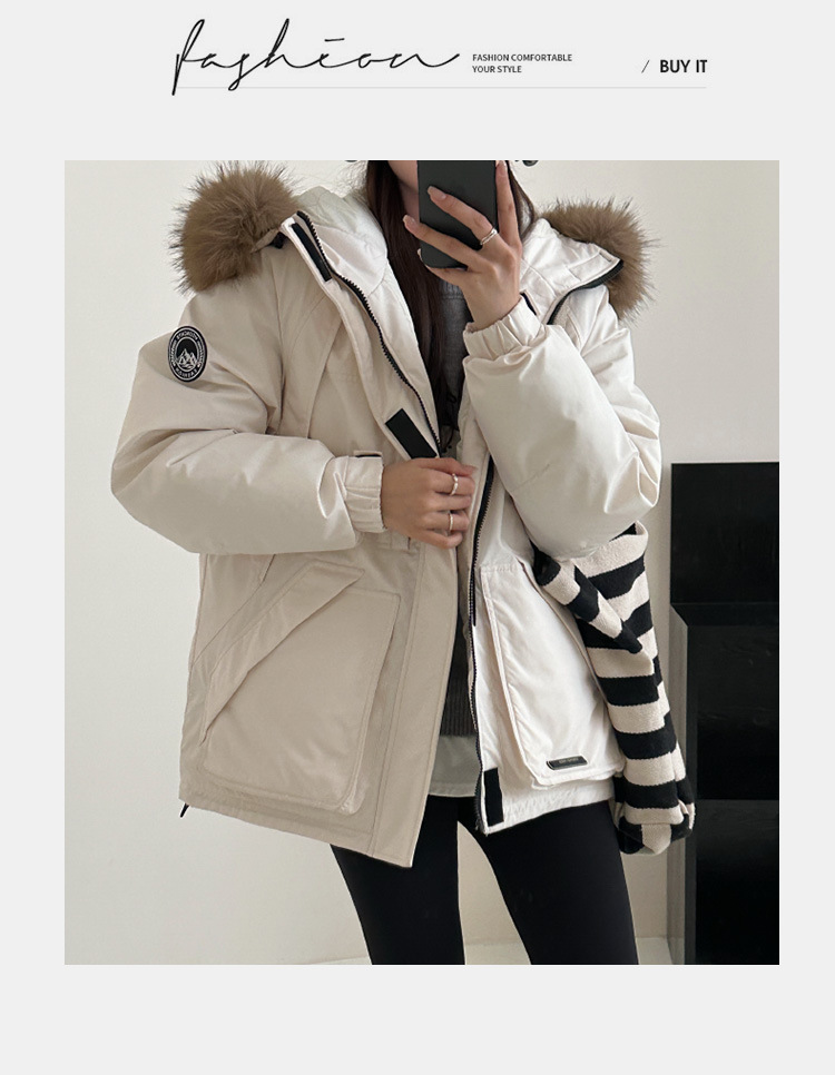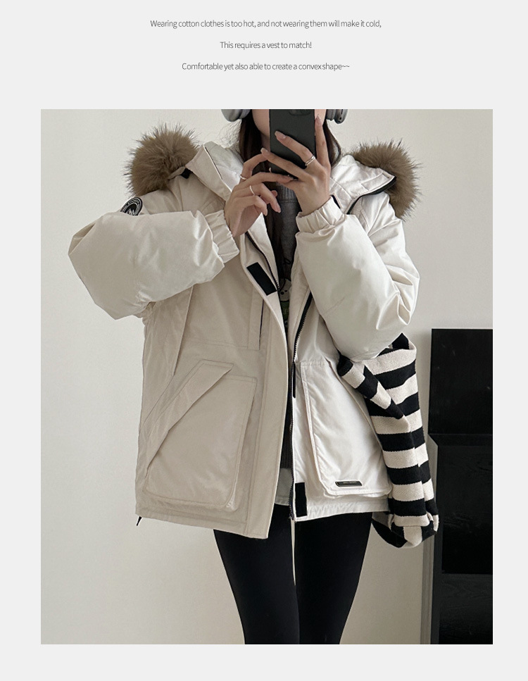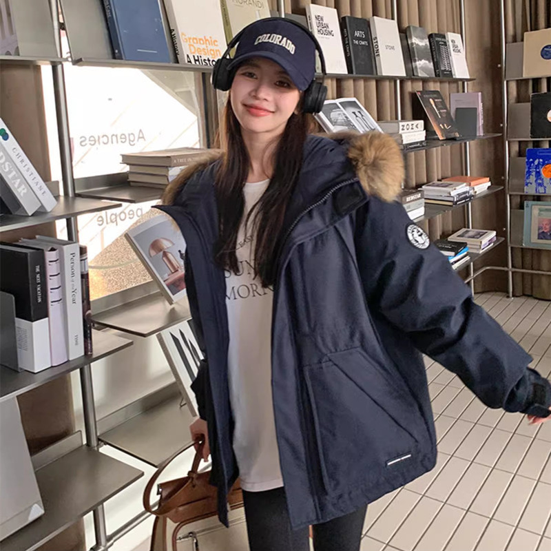 2025冬新作ファー襟パーカーダウンジャケットレディースゆったり韓国風ホワイトダックダウンワークジャケット小柄な人向け