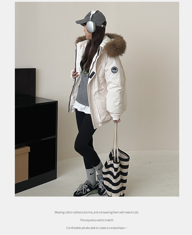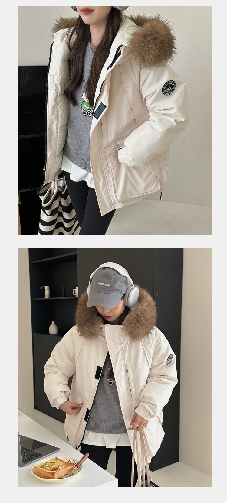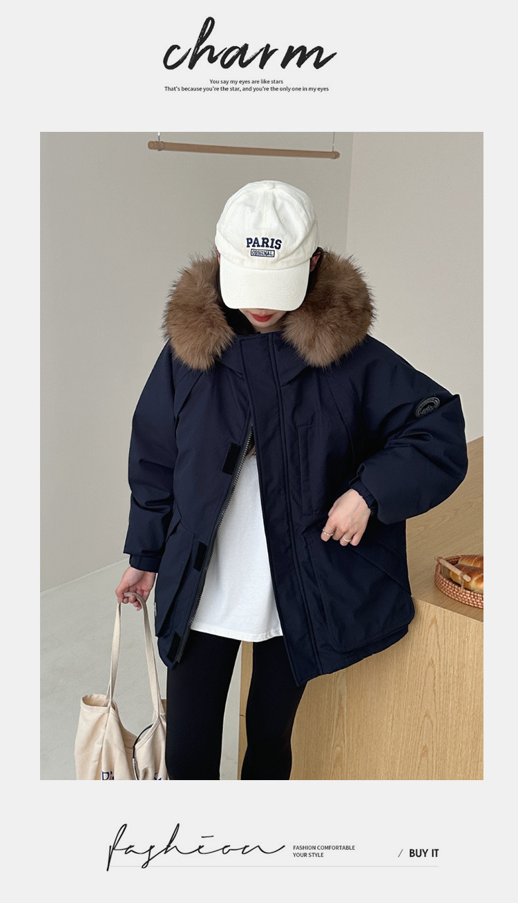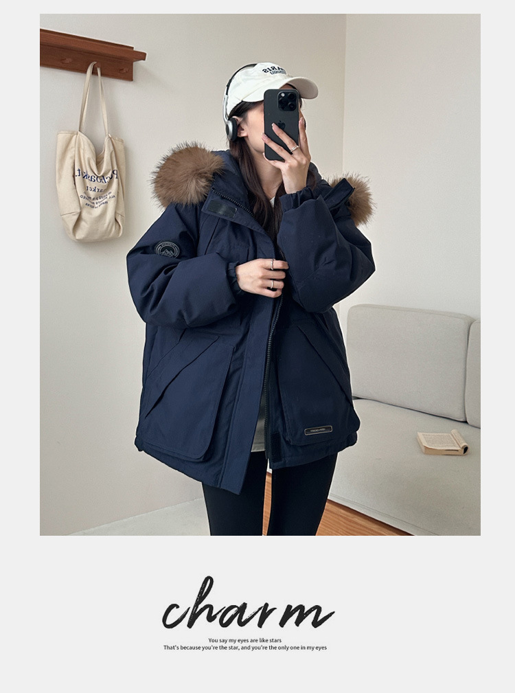 2025冬新作ファー襟パーカーダウンジャケットレディースゆったり韓国風ホワイトダックダウンワークジャケット小柄な人向け