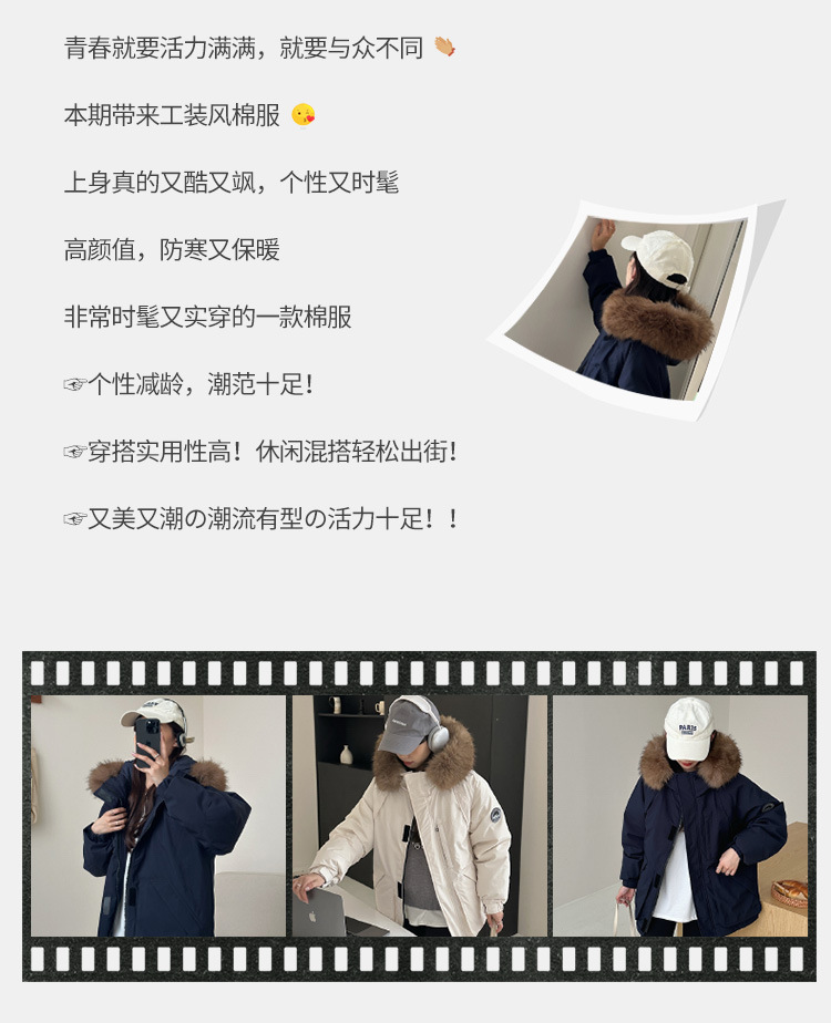 2025年冬季新款美式工装外套女学生加厚百搭派克服连帽毛领棉服潮