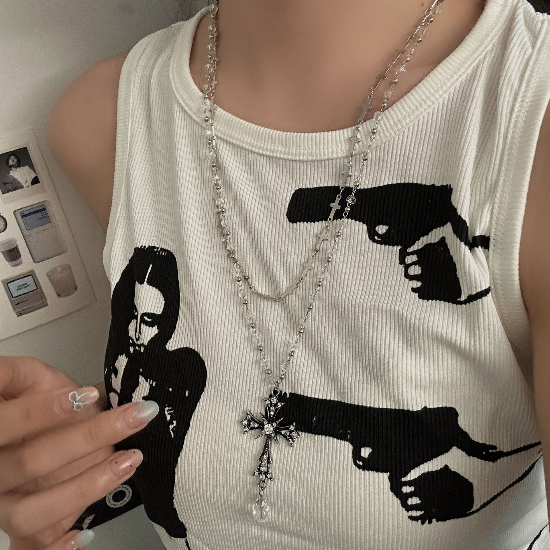 甘くてクールな y2k パーソナライズされた多層クリスタルビーズクロスネックレス女性ニッチホットガール鎖骨チェーンジュエリートレンド